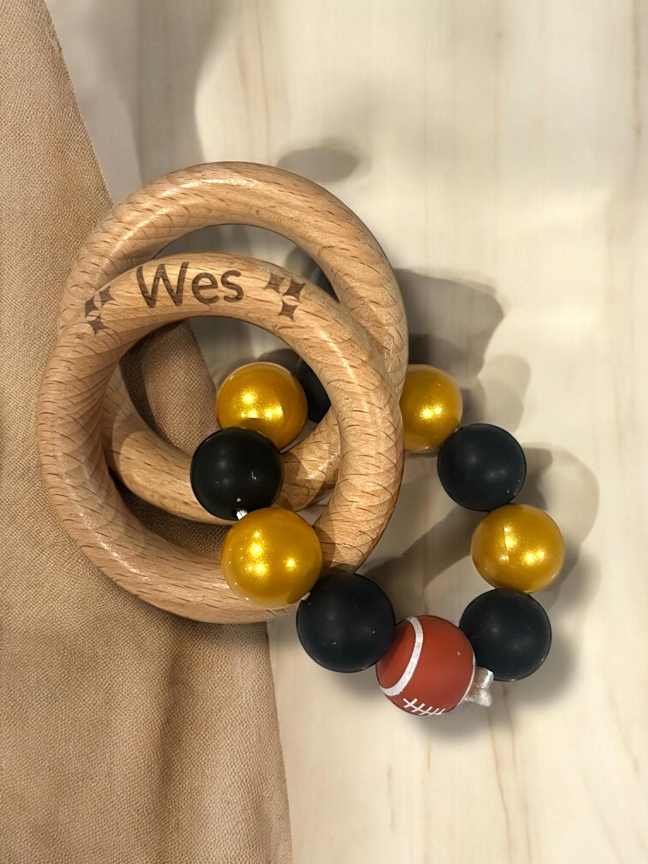 Big fan of Football? 🏈 You live for the Dallas Cowboys? Get your little one the matching rattle and pacifier chains. personalized name beechwood rattle rings with dark blue/white/silver beads. All beads food grade silicone.