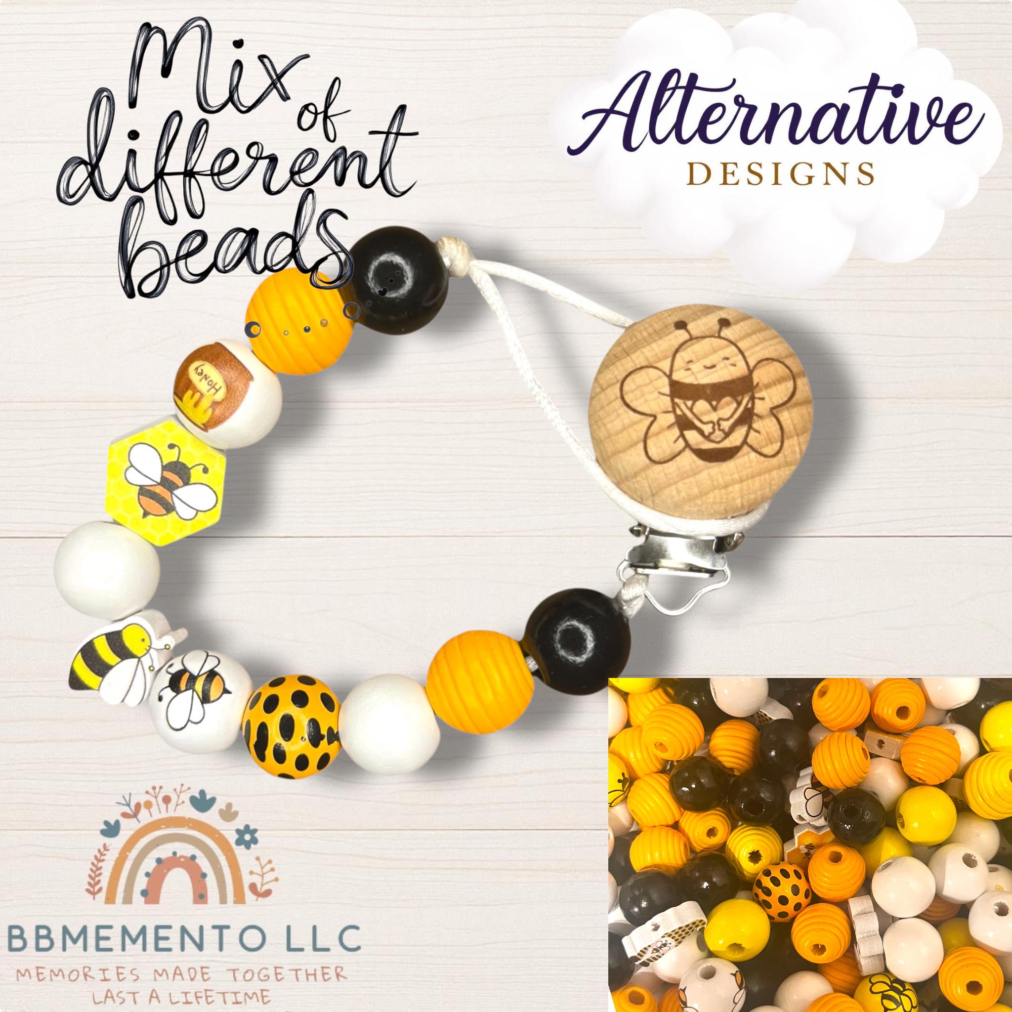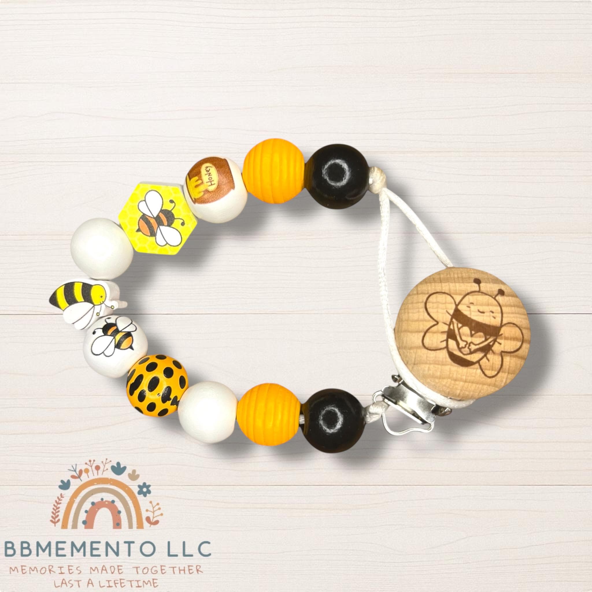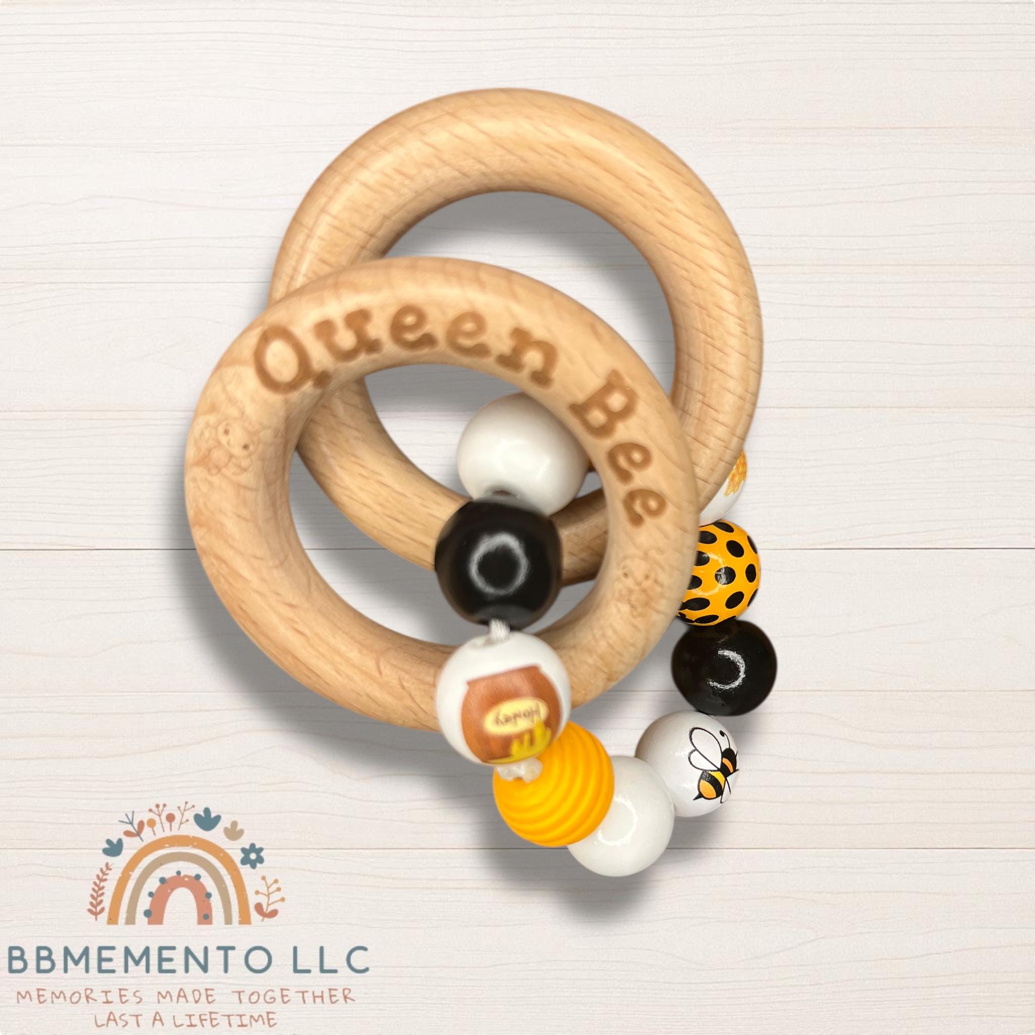 You will find here our honey bee themed personalized rattle and pacifier for your little baby girl or boy. perfect gift for a bee themed baby shower or gender reveal party “what will it bee?”. All beads are wooden. We also offer different versions. Ask us for more options!