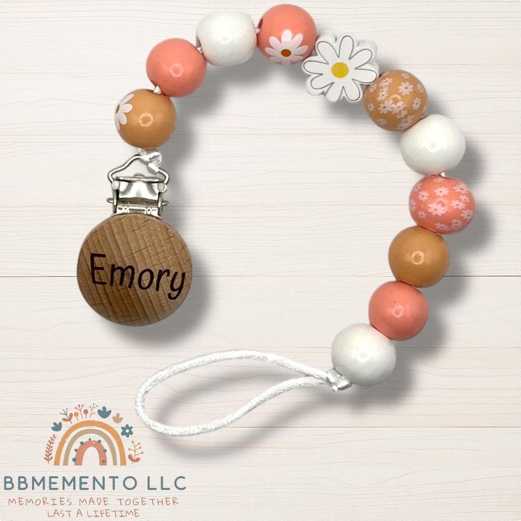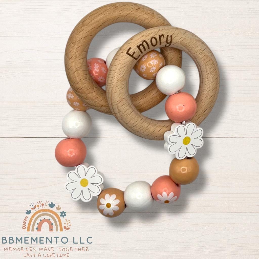 You will find here our daisy spring personalized rattle for your little baby girl. Fully made out of Beechwood. All beads are wooden and in pink/white/brown with daisies. We also offer different versions with bees and cars for example.