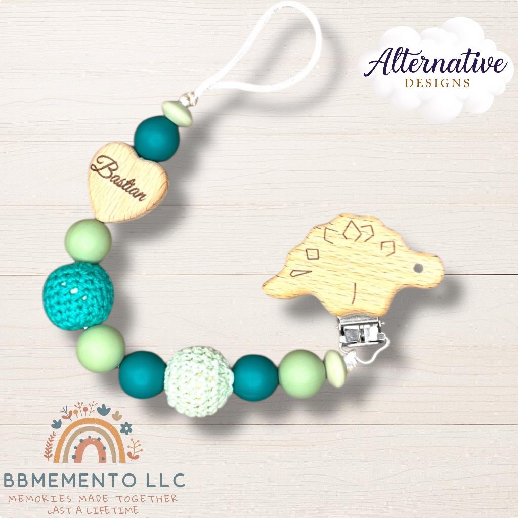 You will find here our personalized pacifier clip with crochet wood and silicone beads with personalized engraved wood clip.