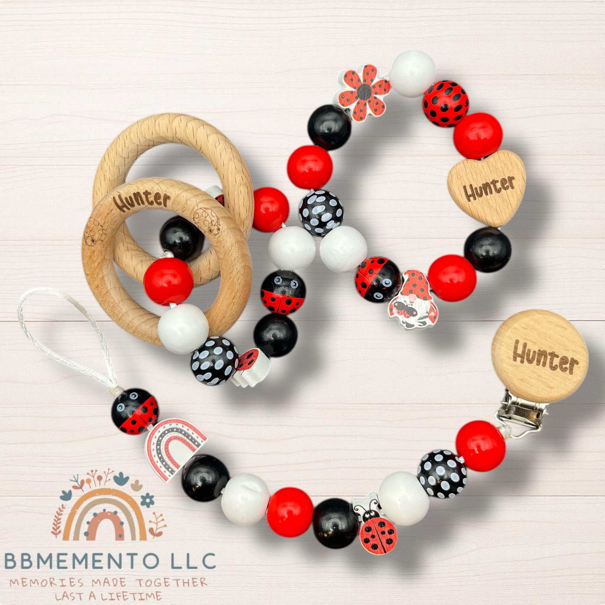 You will find here our ladybug themed personalized rattle and pacifier for your little baby girl or boy. All beads are wooden and in red and black with white accents with ladybug and gnome themed beads. We also offer different versions with daisies, honey bees or ocean.