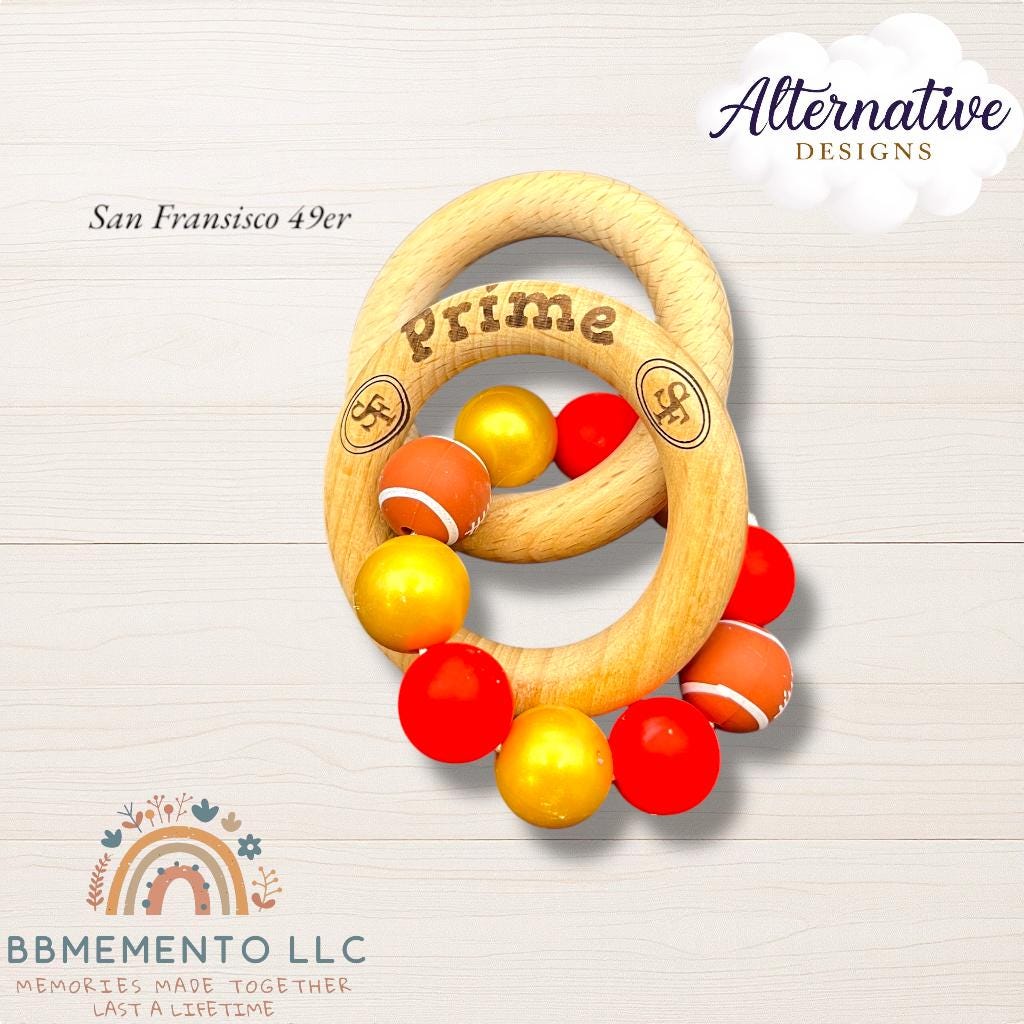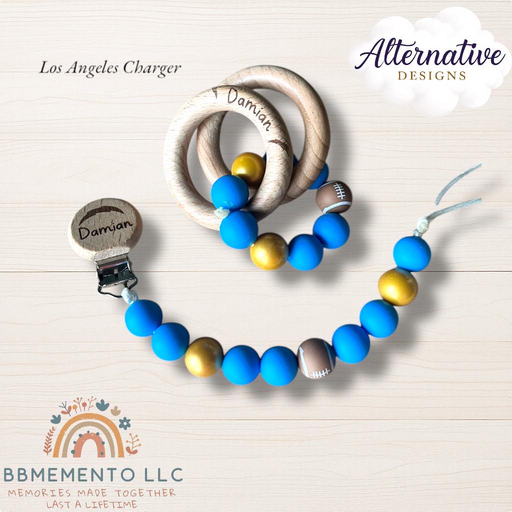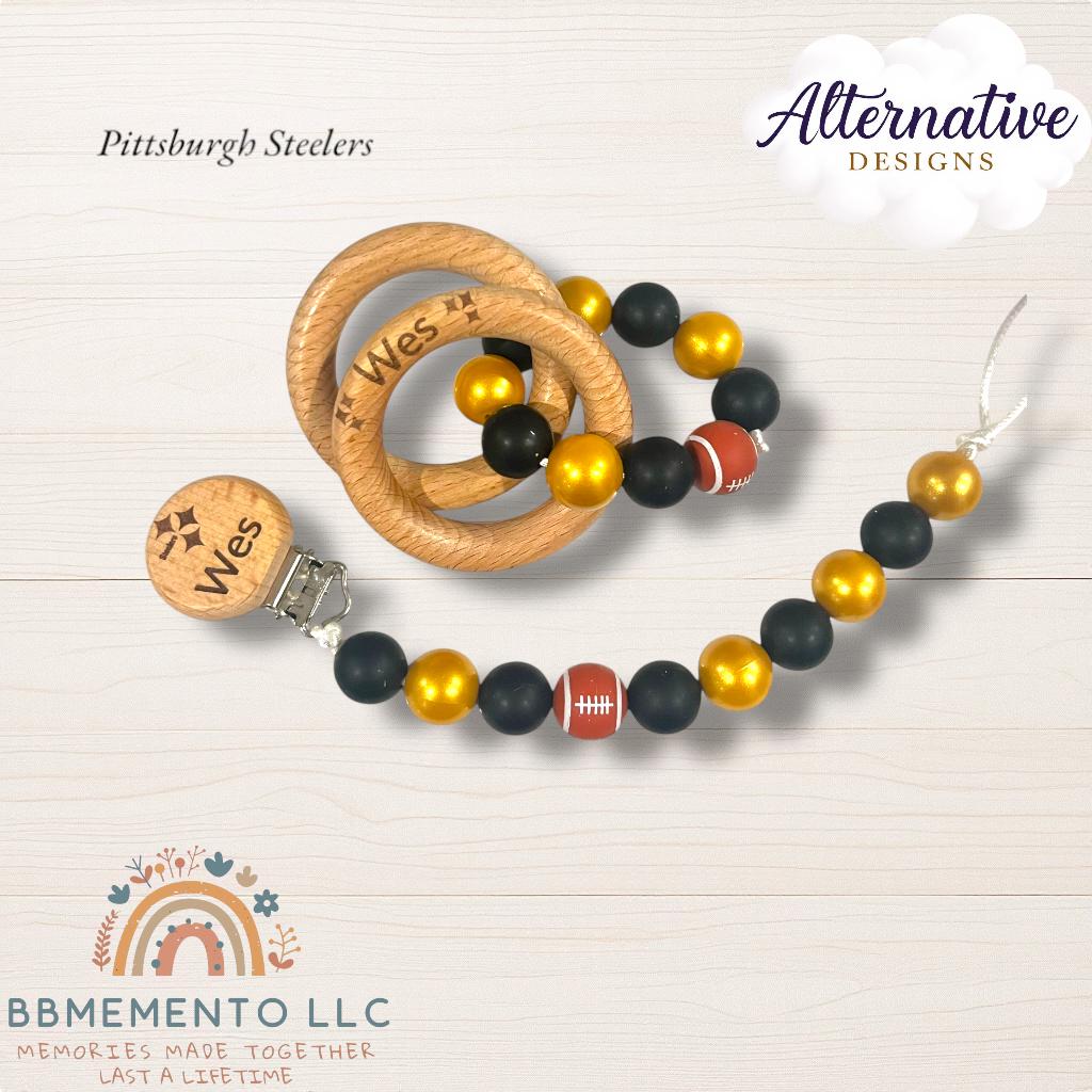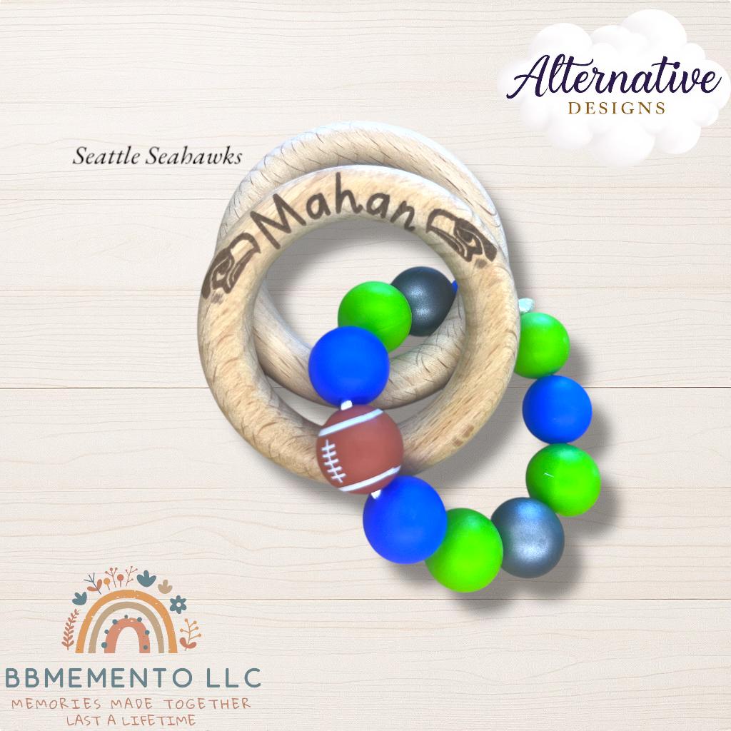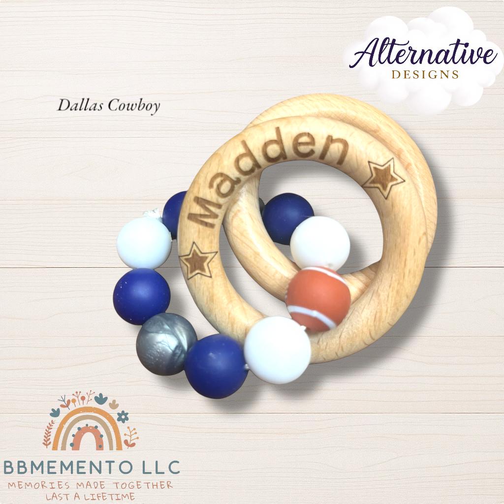Big fan of Football? 🏈 You live for tue Dallas Cowboys? Get your little one the matching rattle and pacifier chills. Personalized name beechwood rattle rings with dark blue/white/silver beads. All beads food grade silicone.
