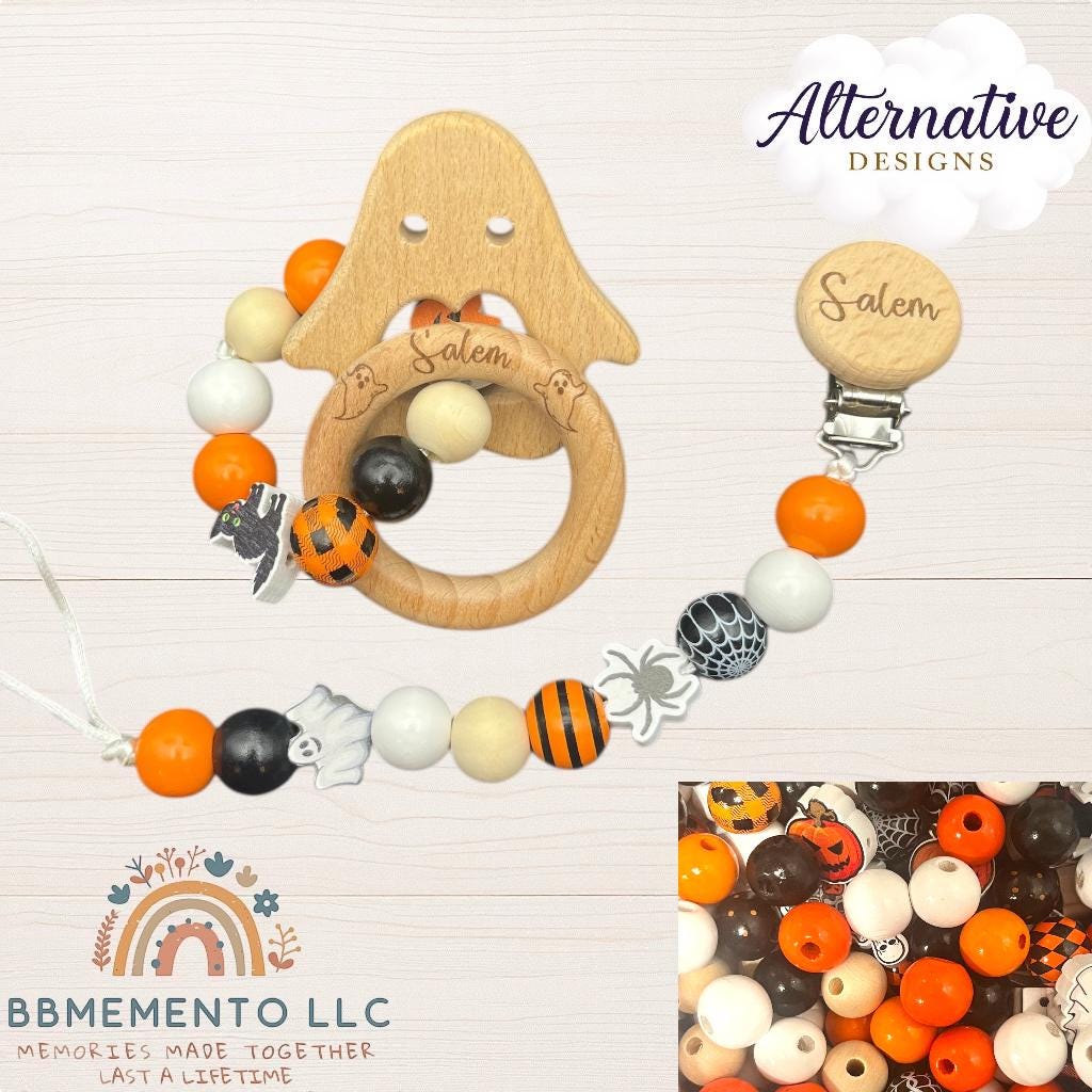You will find here our Halloween themed personalized rattle and pacifier for your little baby girl or boy. Fully made out of Beechwood. All beads are wooden. We also offer different versions. Ask us for more options!