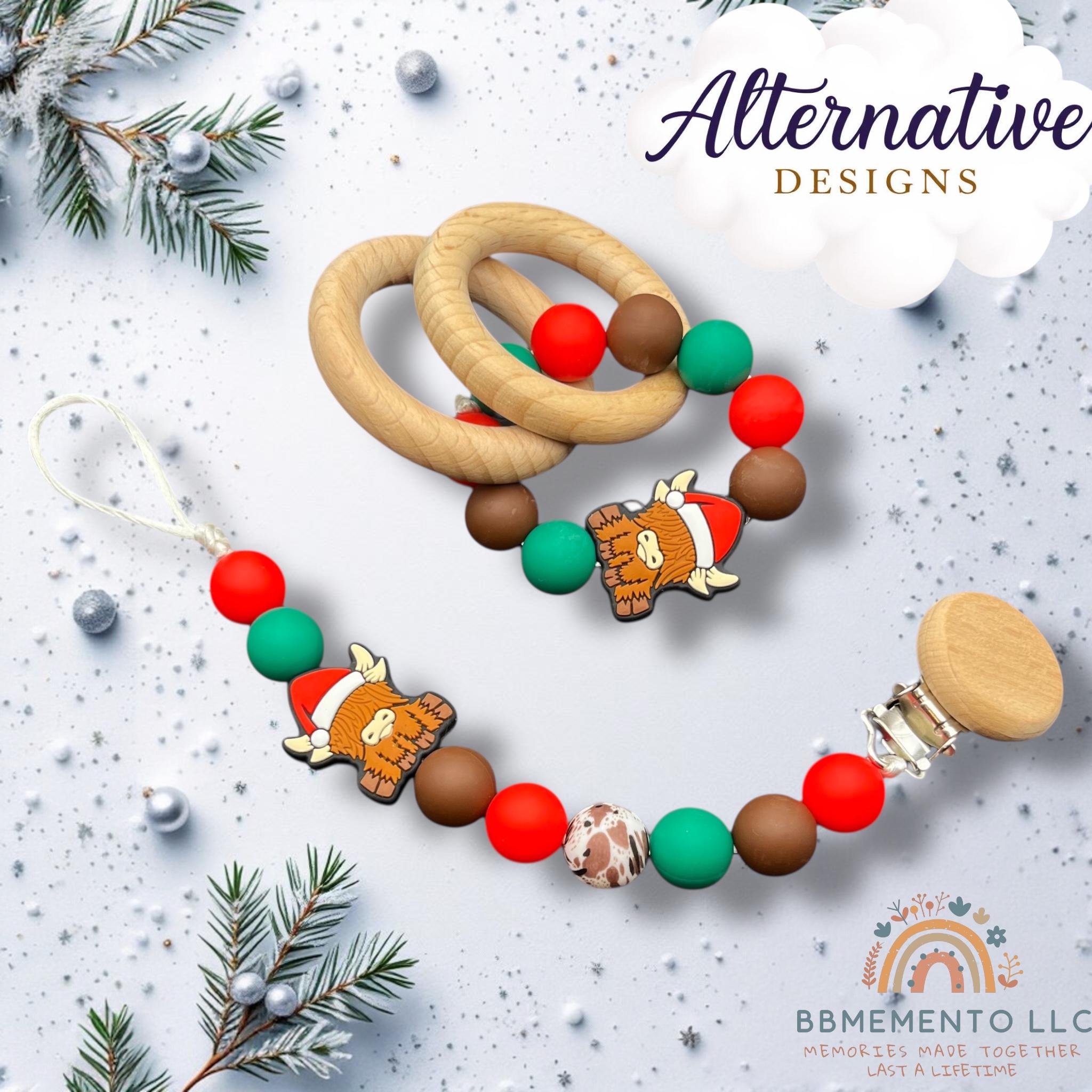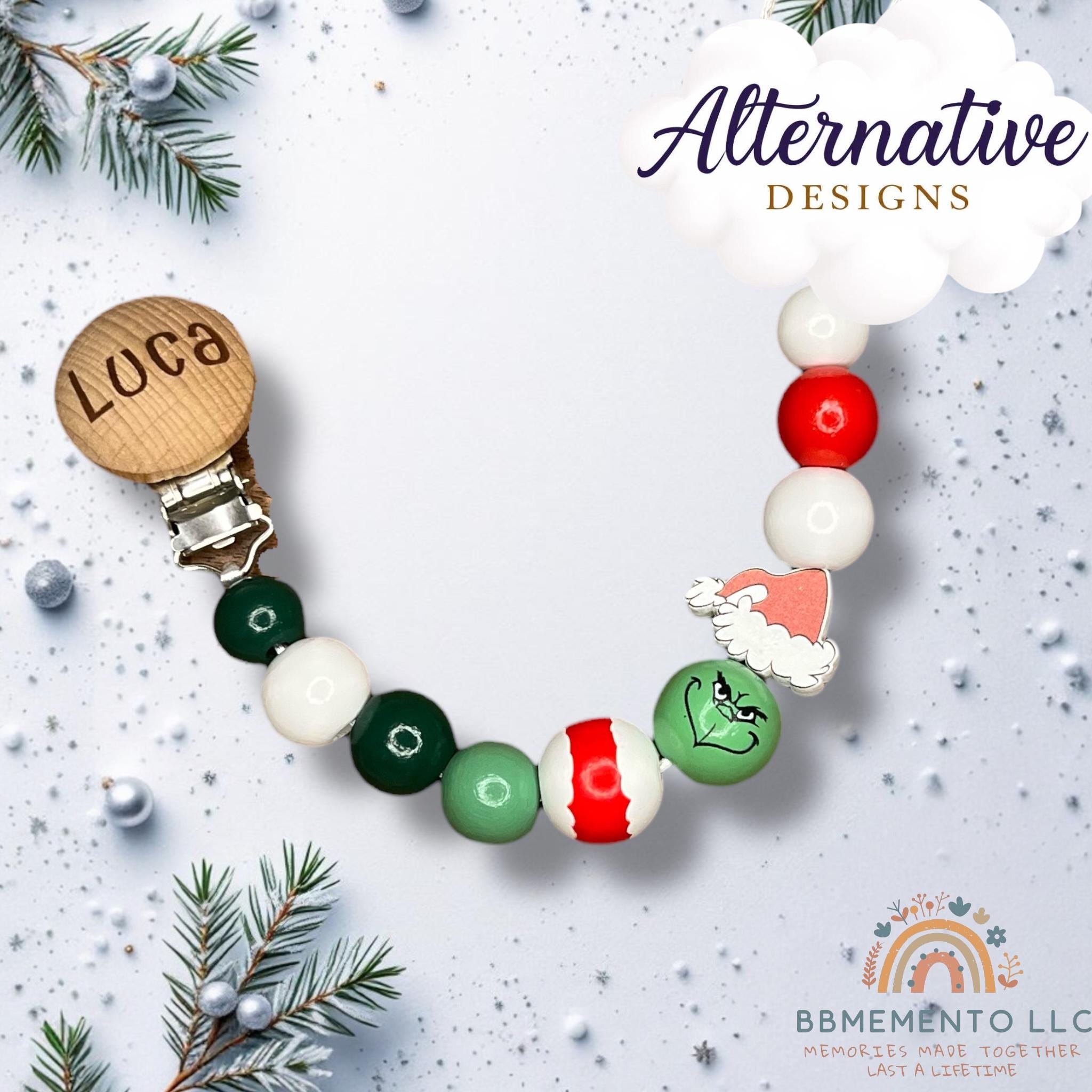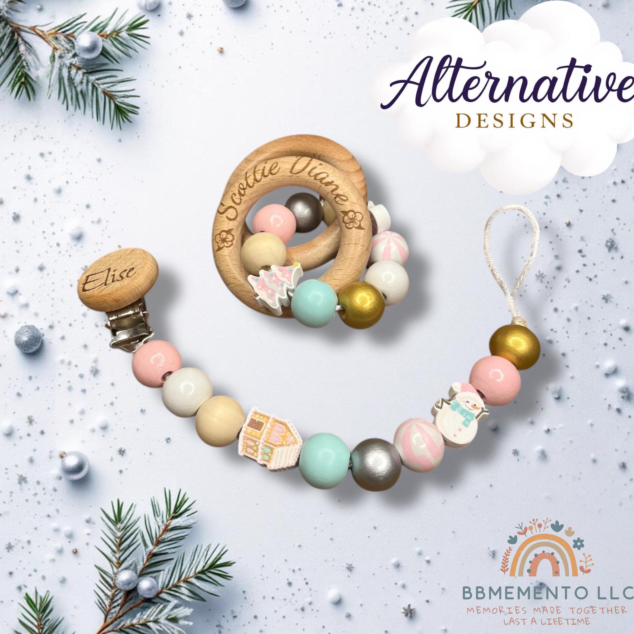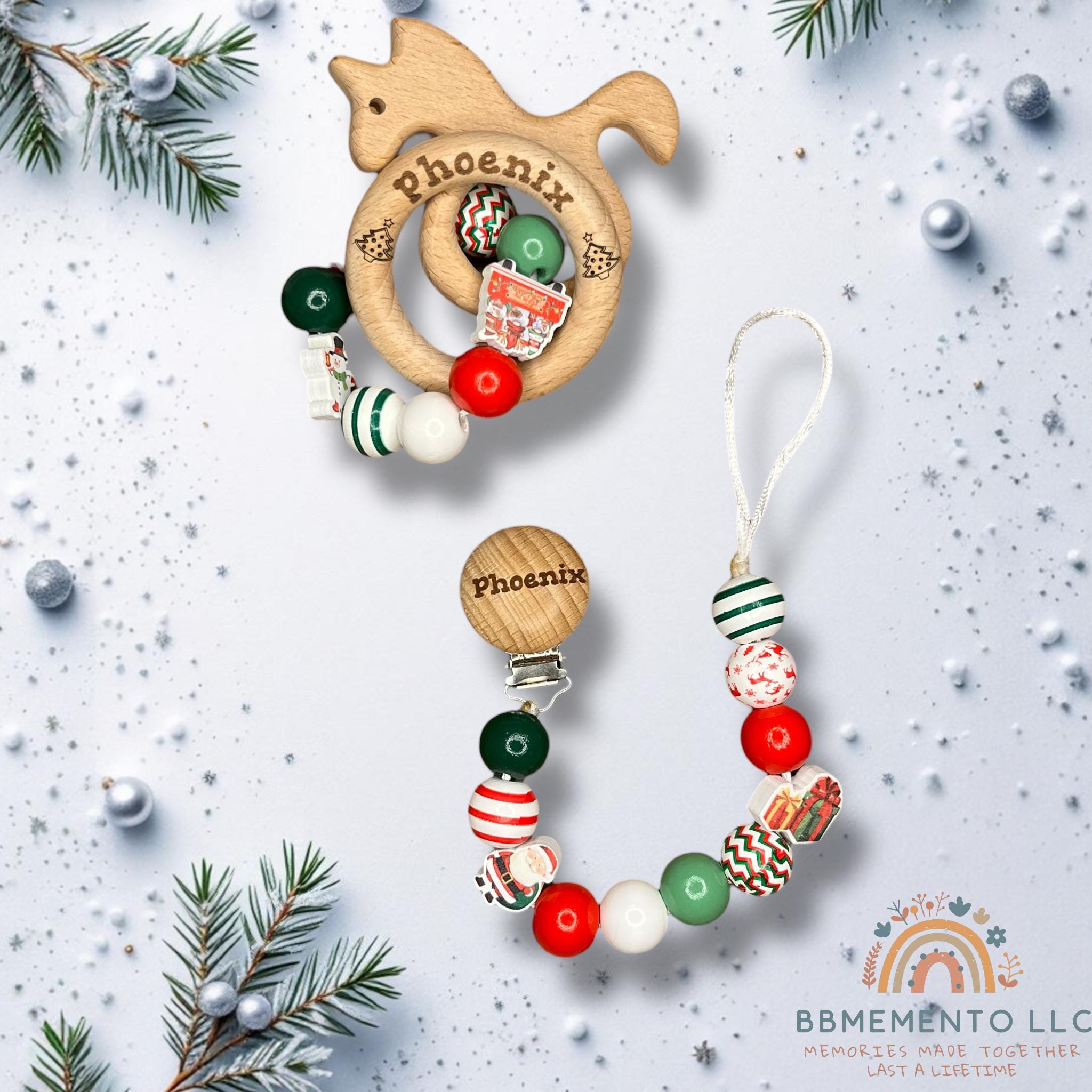 You will find here our Christmas Holiday themed personalized rattle and pacifier for your little baby girl or boy. Fully made out of Beechwood. All beads are wooden. We also offer different versions. Ask us for more options! The beads come in different variations so it can change on each item.