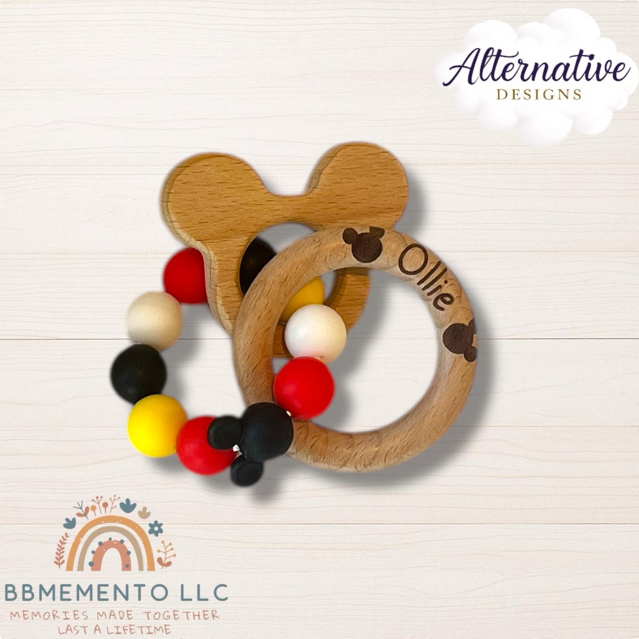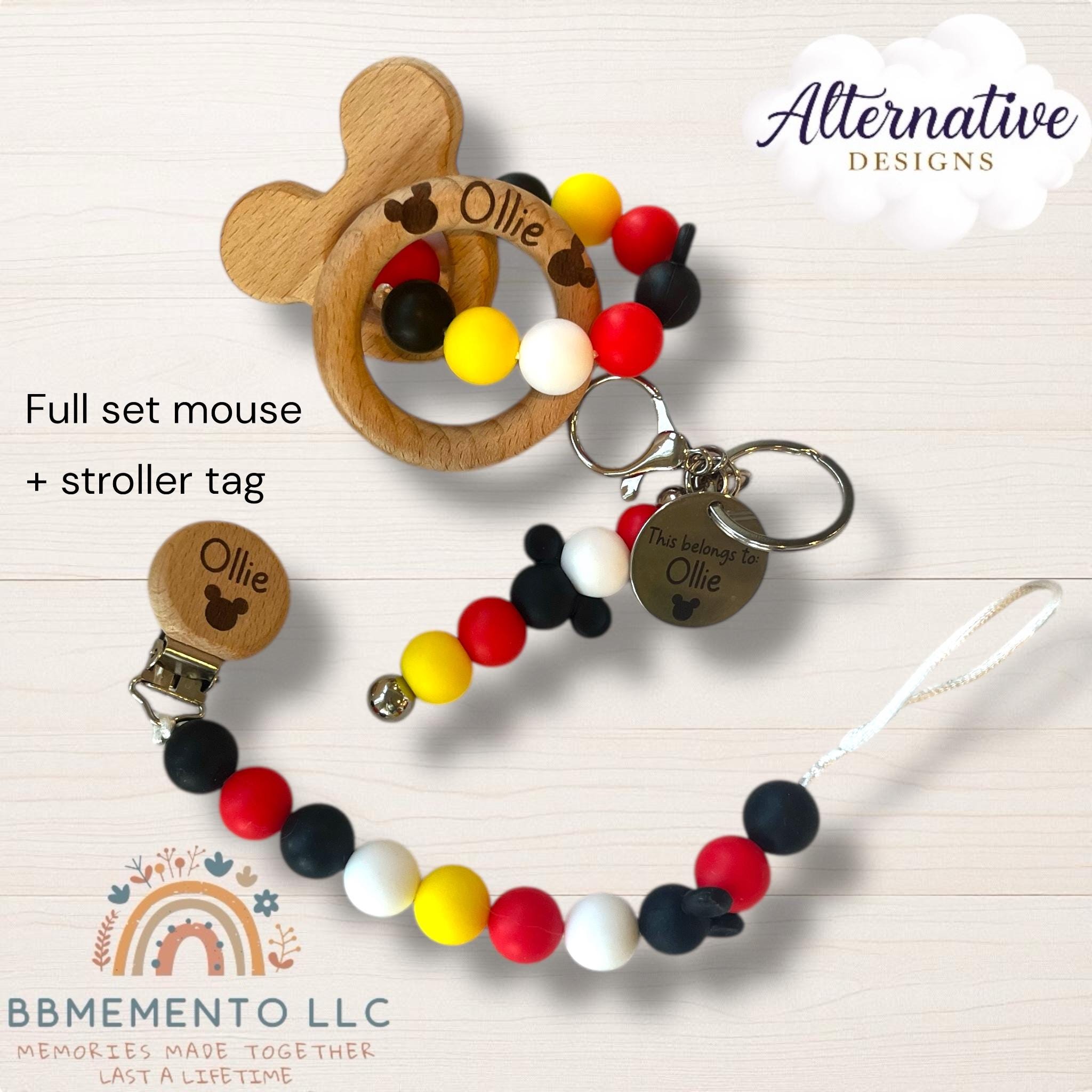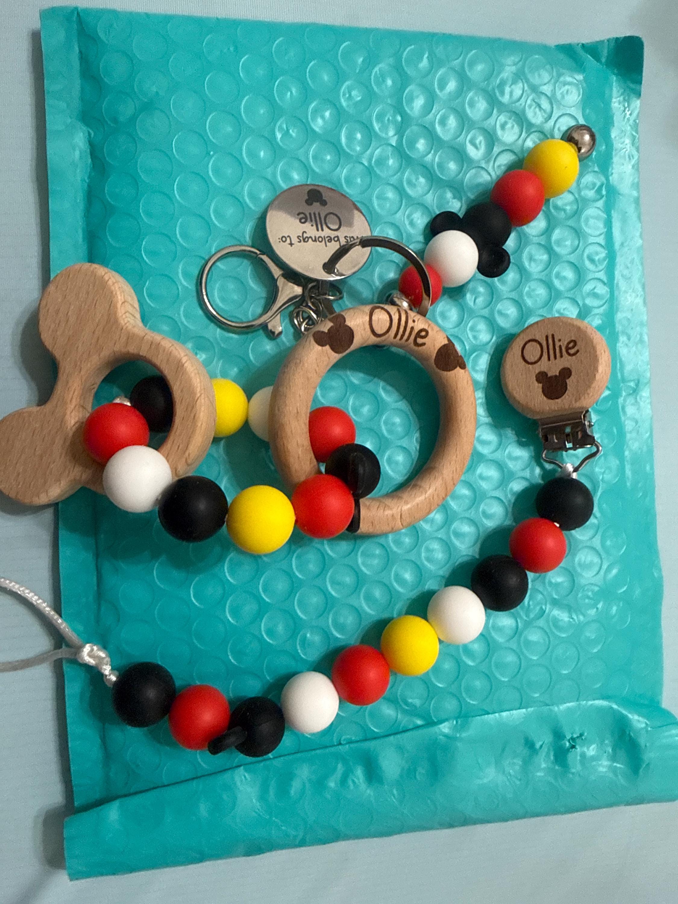 You will find here our mouse themed personalized rattle and pacifier for your little baby girl or boy. With food grade silicone beads. We also offer different versions. Ask us for more options!