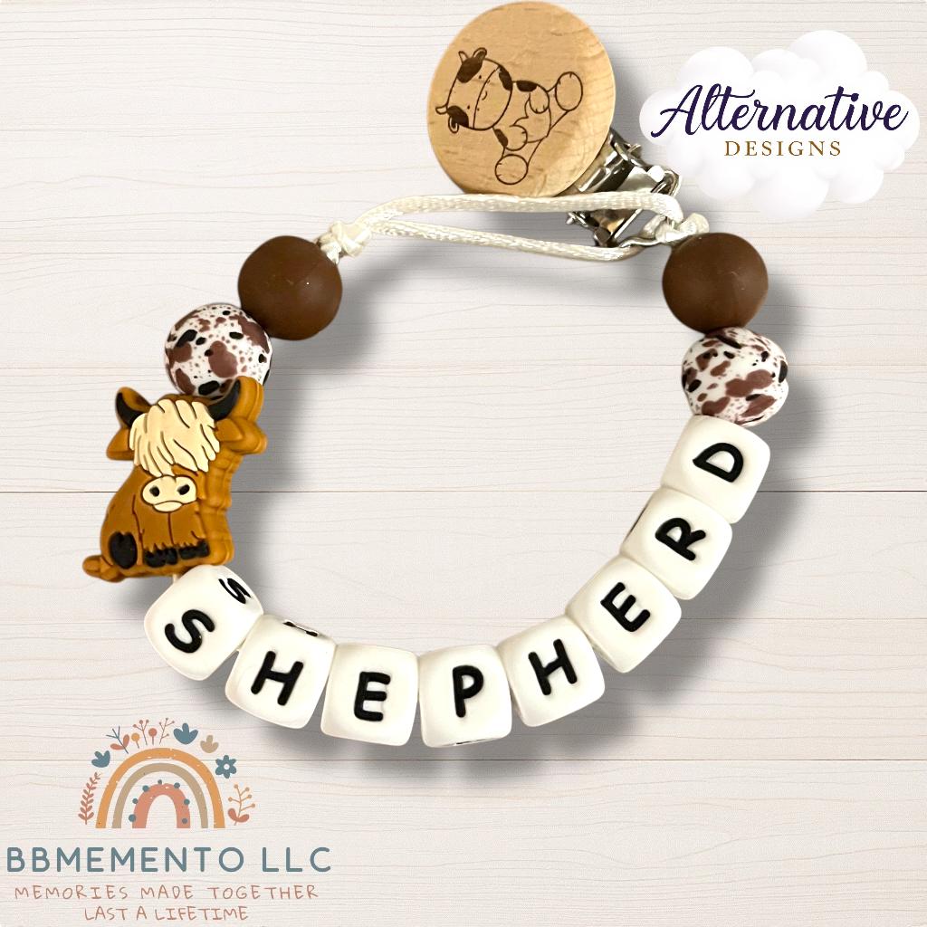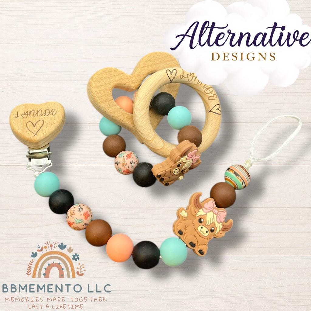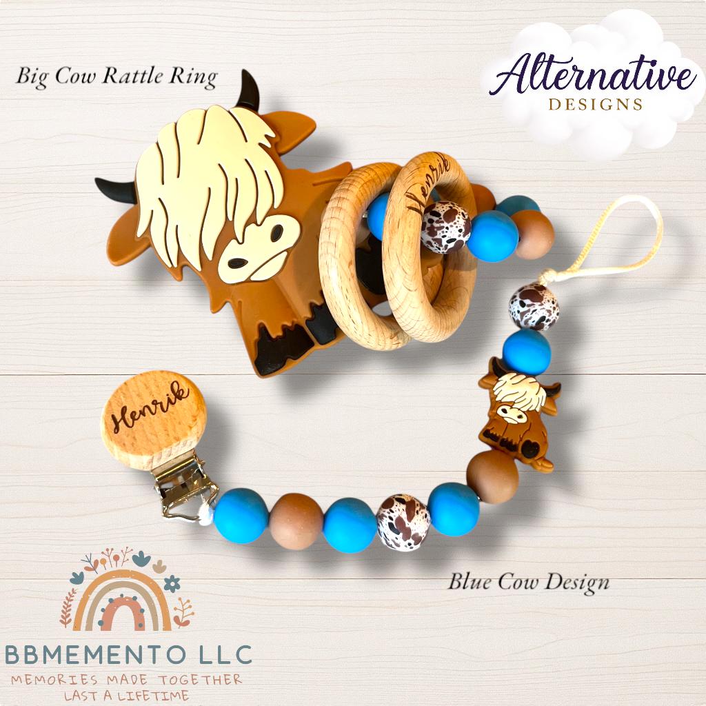 This personalized pacifier clip and rattle comes in our cute highland cow design. Tell us in the customization what you would like. We can either engrave a cow on the clip or baby’s name. We offer different color and also cow versions. Black and white, brown, brown with flower and a dessert cactus design.