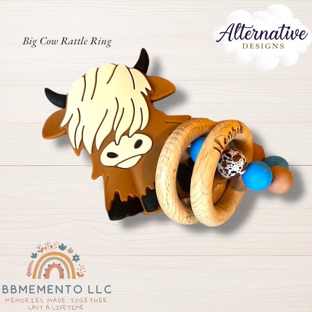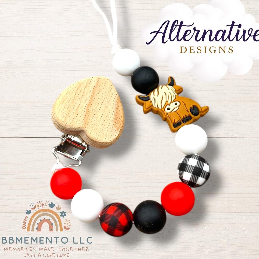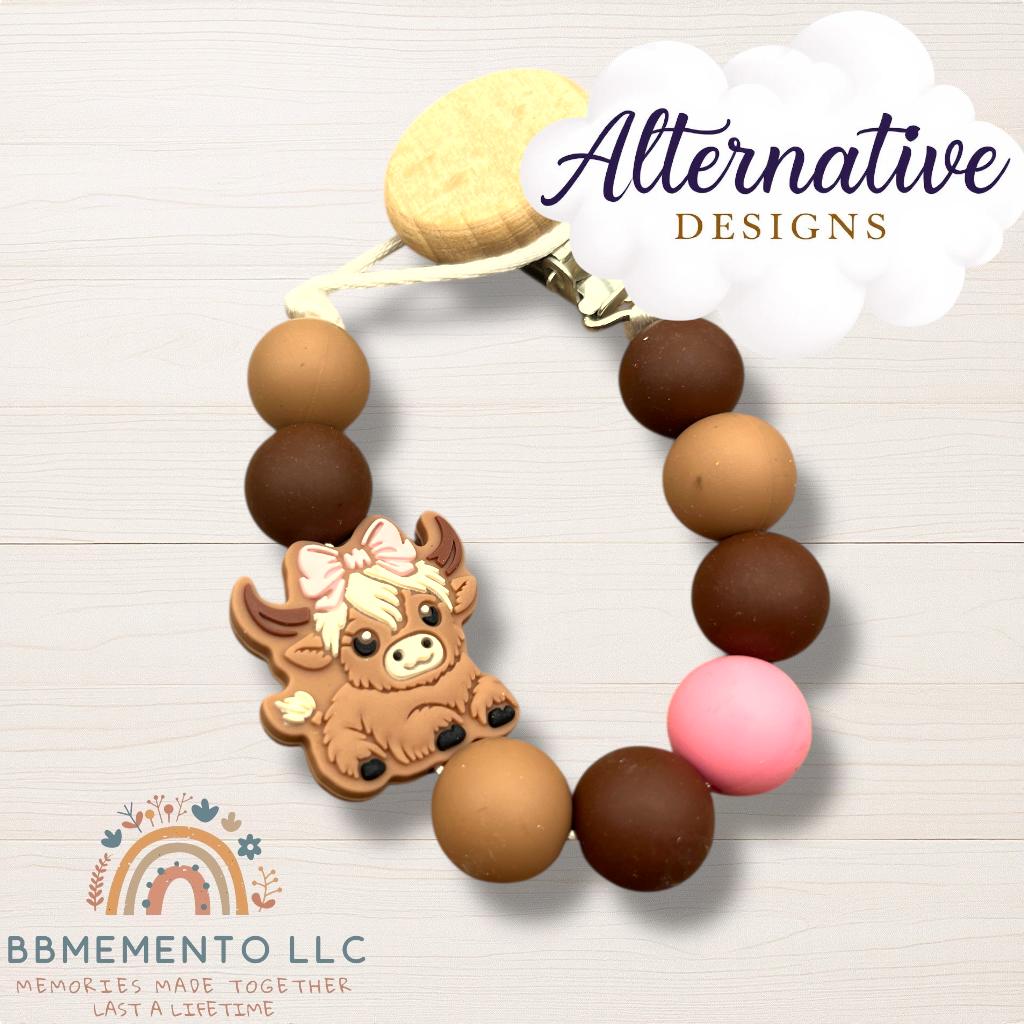 This personalized pacifier clip and rattle comes in our cute highland cow design. Tell us in the customization what you would like. We can either engrave a cow on the clip or baby’s name. We offer different color and also cow versions. Black and white, brown, brown with flower and a dessert cactus design.
