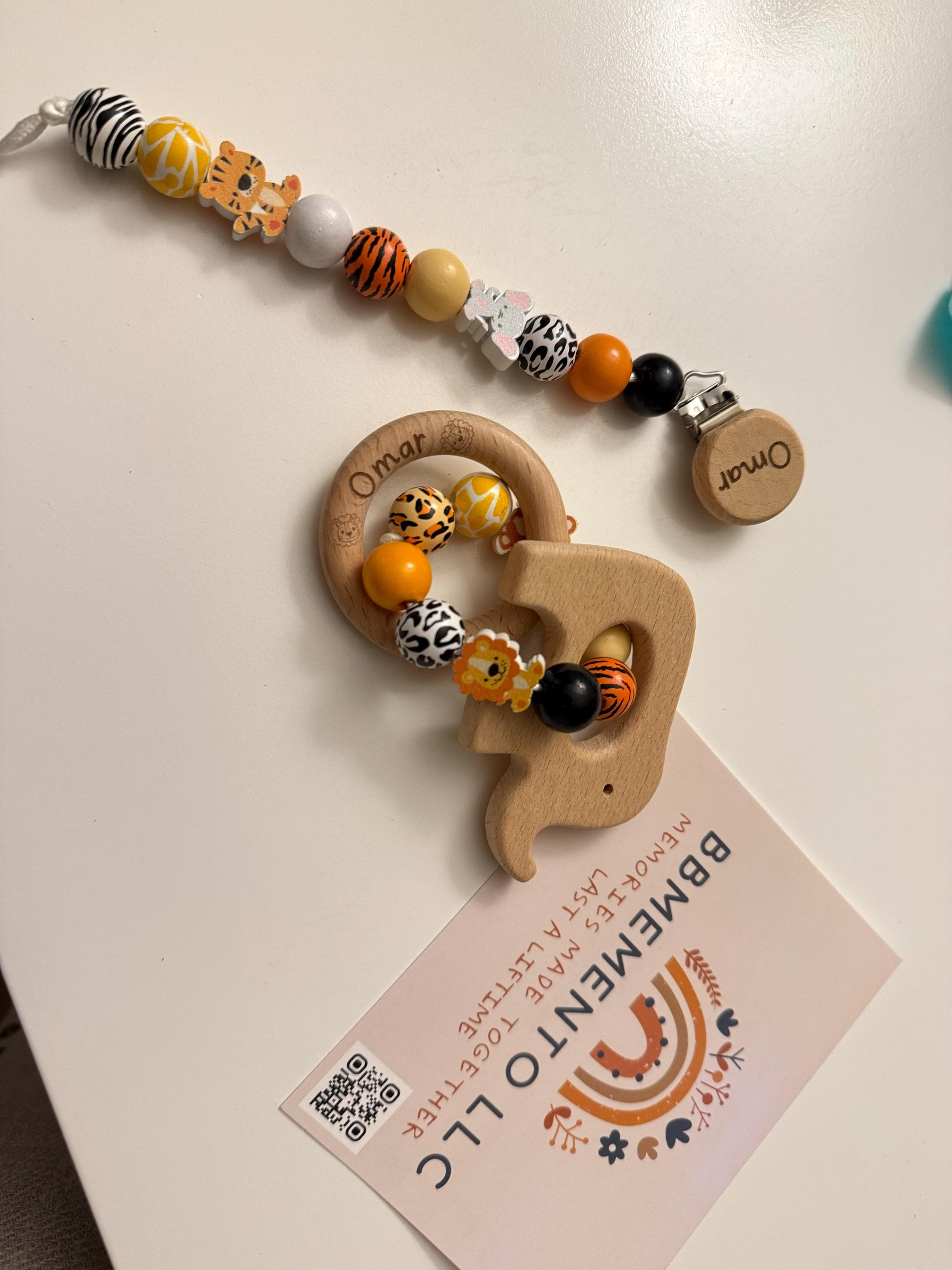 Our personalized pacifier clip and rattle shows of a great baby theme with this safari look. Elephants, Tiger, Lion, Monkeys and Zebras are coming together for this natural look pacifier holder and the beechwood ring rattle with a cute elephant ring.