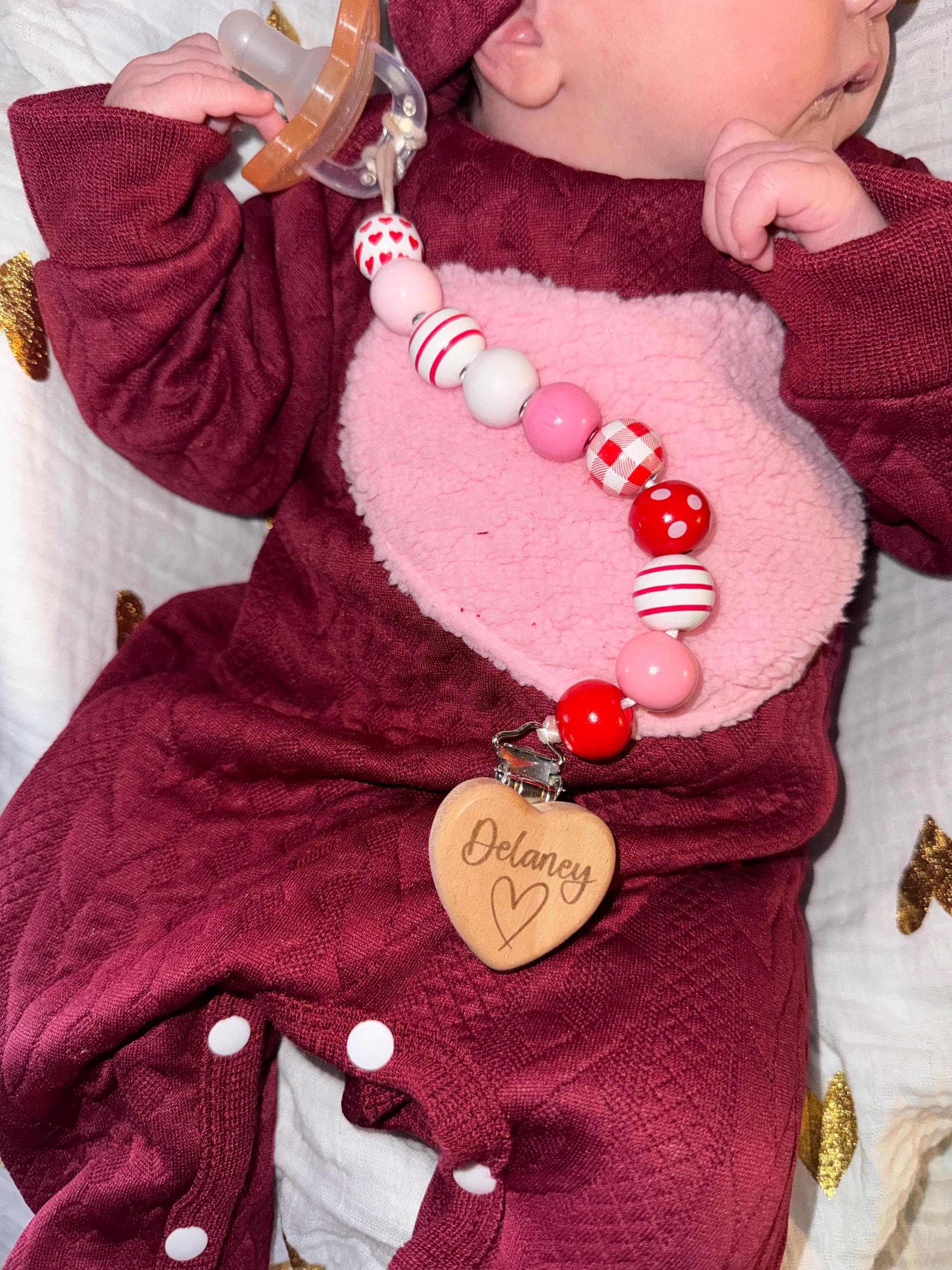 Celebrate Valentine’s Day with this beautiful personalized pacifier clip and rattle set. All clips and rattles are handmade in Kansas City. We are engraving the wooden Pacifier Clip and Rattle with name or just a heart if no personalization wanted.