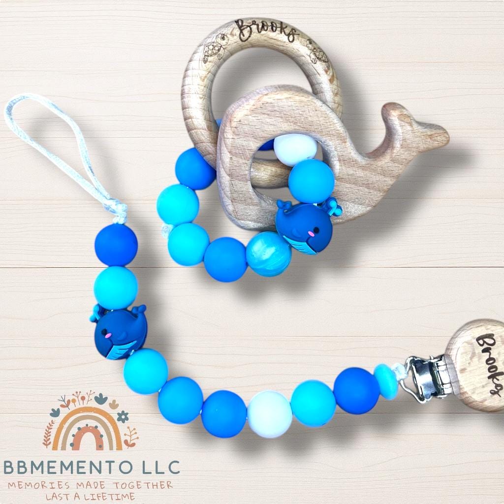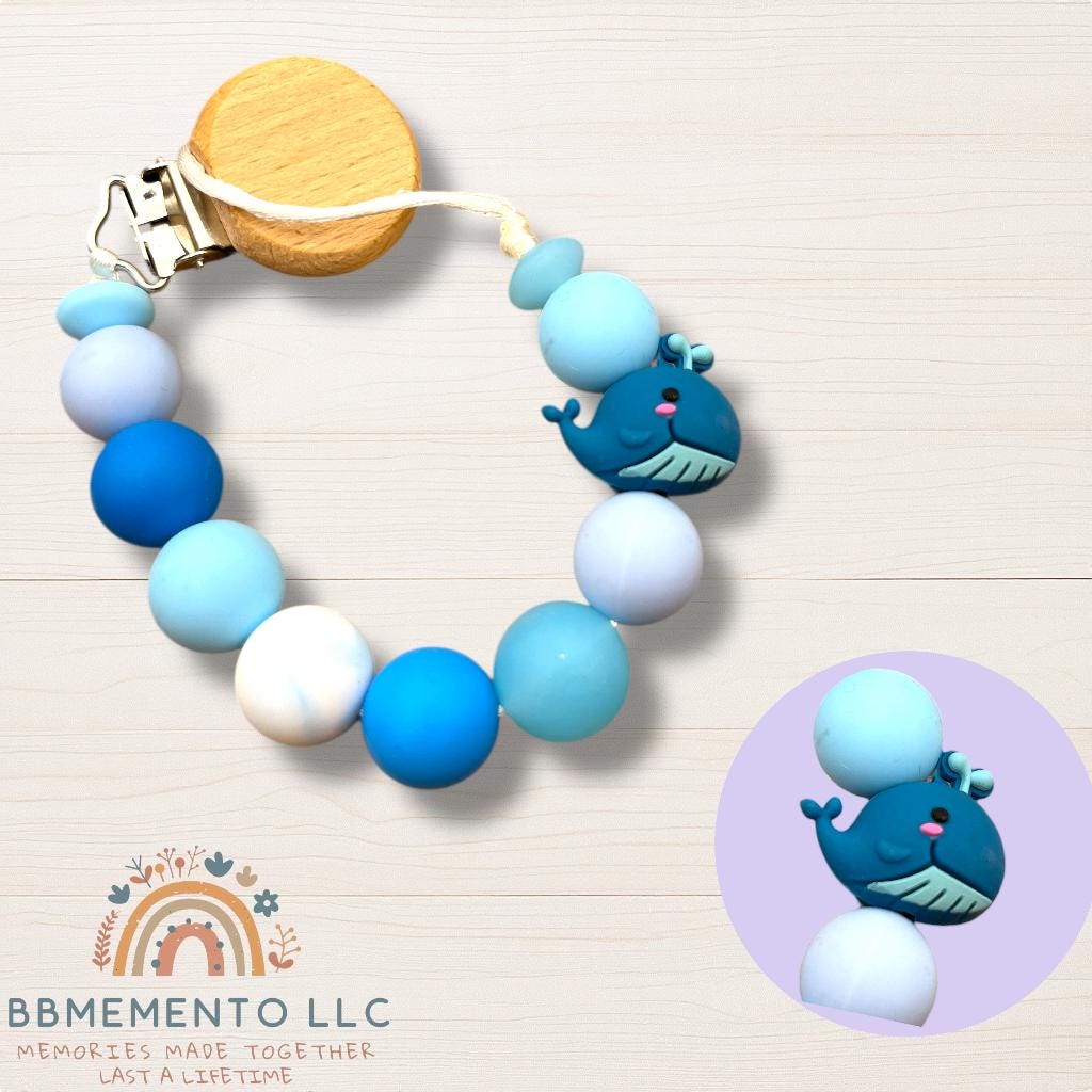 You will find here our baby whale, blue ocean beach summer themed personalized rattle and pacifier for your little baby girl or boy. All beads are food grade and BPA free silicone. The clip is made of beechwood with stainless steel . We also offer different versions. Ask us for more options!