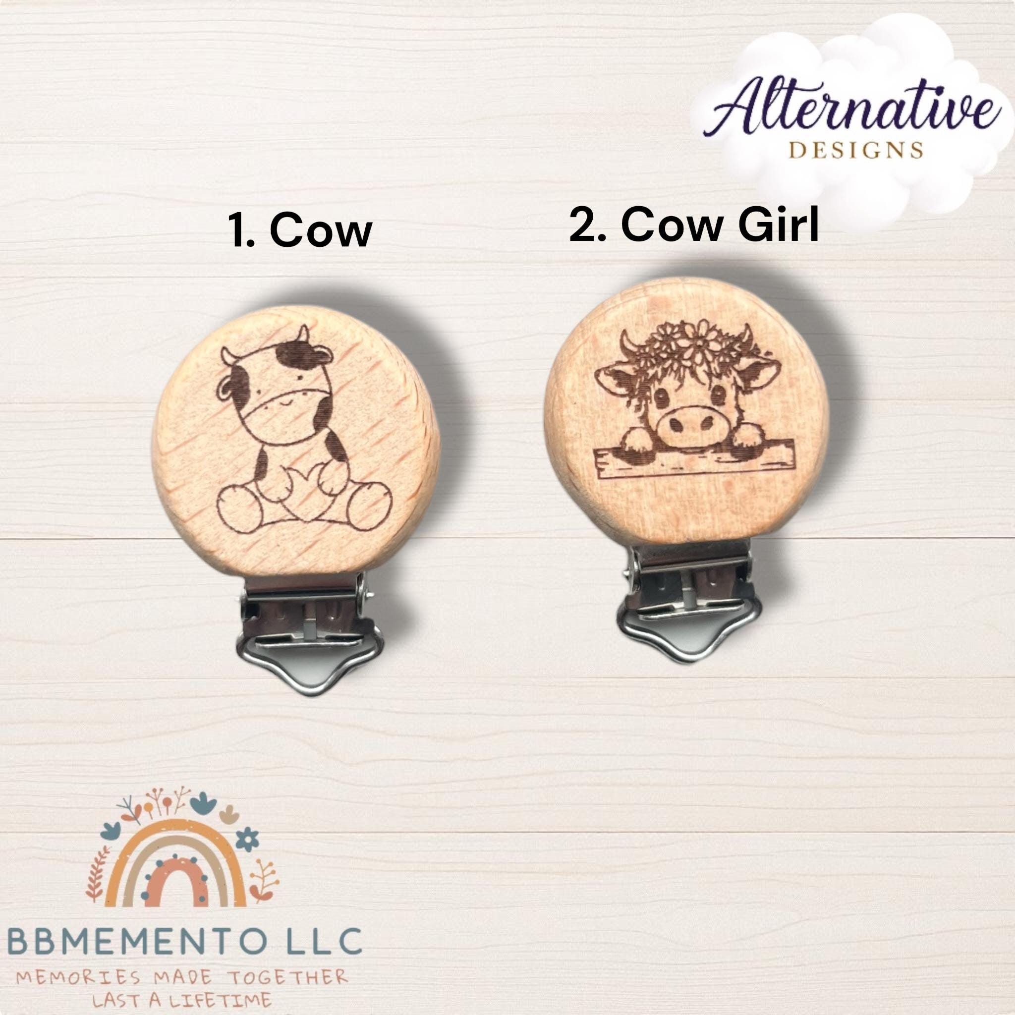This personalized pacifier clip and rattle comes in our cute highland cow design. Tell us in the customization what you would like. We can either engrave a cow on the clip or baby’s name. We offer different color and also cow versions. Black and white, brown, brown with flower and a dessert cactus design.