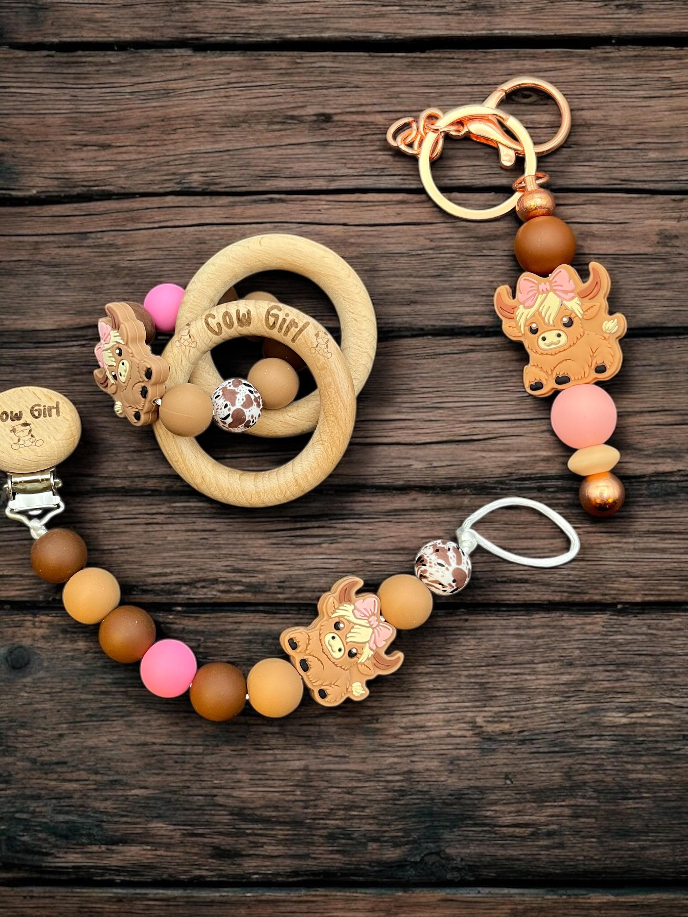 This personalized pacifier clip and rattle comes in our cute highland cow design. Tell us in the customization what you would like. We can either engrave a cow on the clip or baby’s name. We offer different color and also cow versions. Black and white, brown, brown with flower and a dessert cactus design.