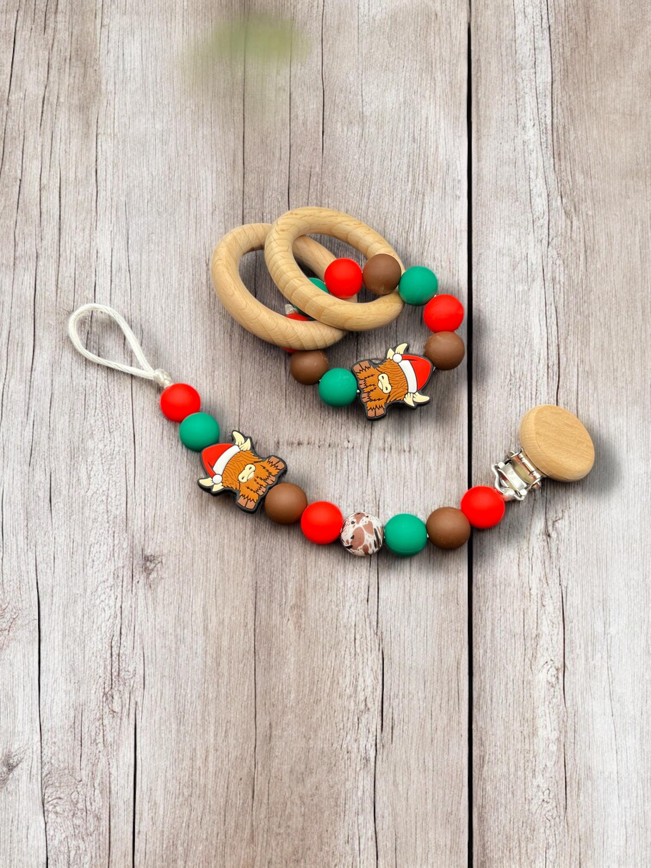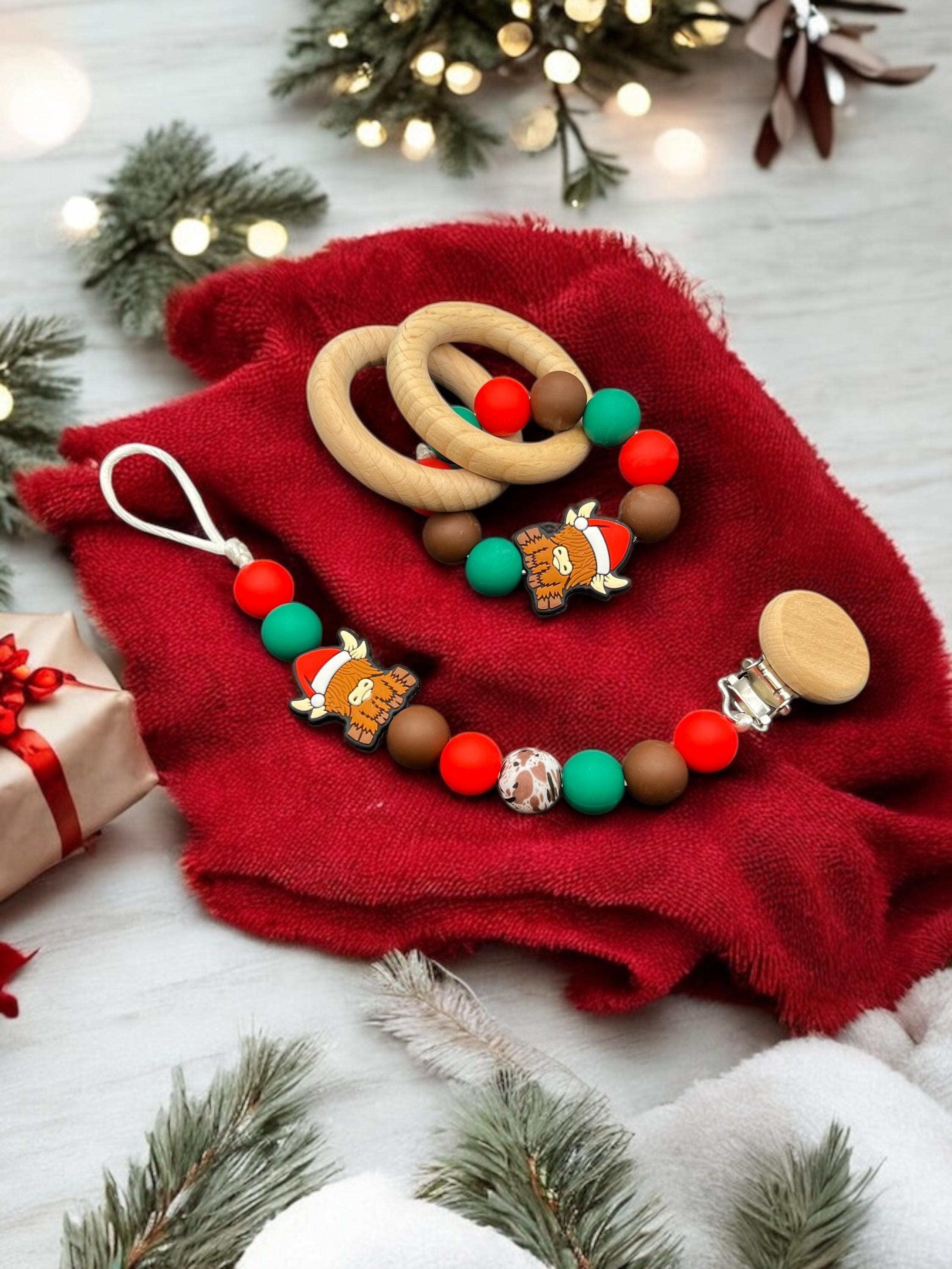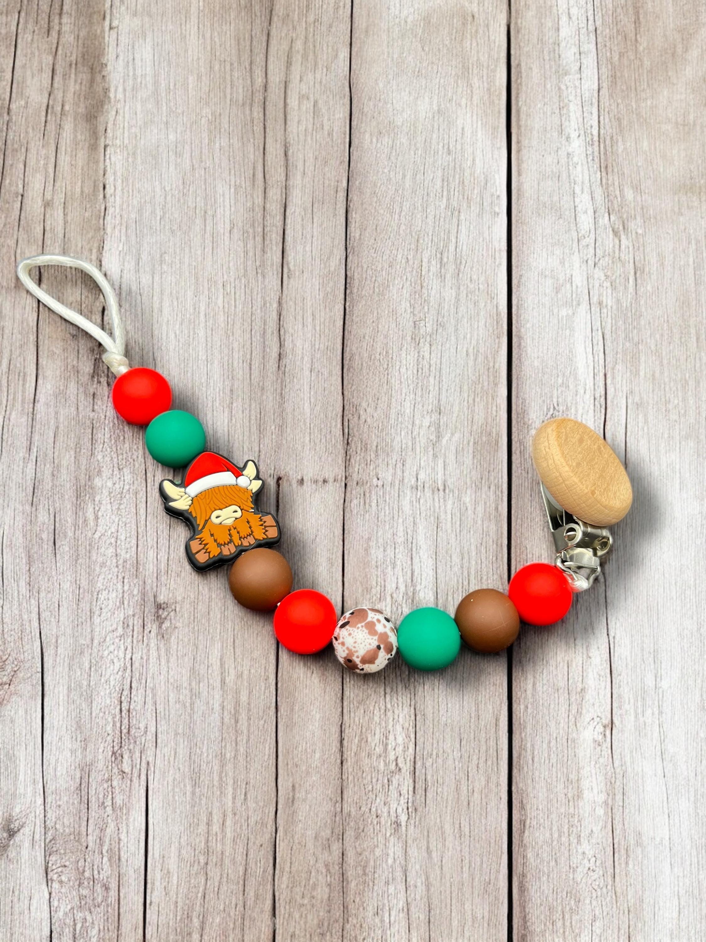 This personalized pacifier clip and rattle comes in our cute Christmas highland cow design. Tell us in the customization what you would like. We can either engrave a cow on the clip or baby’s name. We offer different color and also cow versions. Black and white, brown, brown with flower and a dessert cactus design.