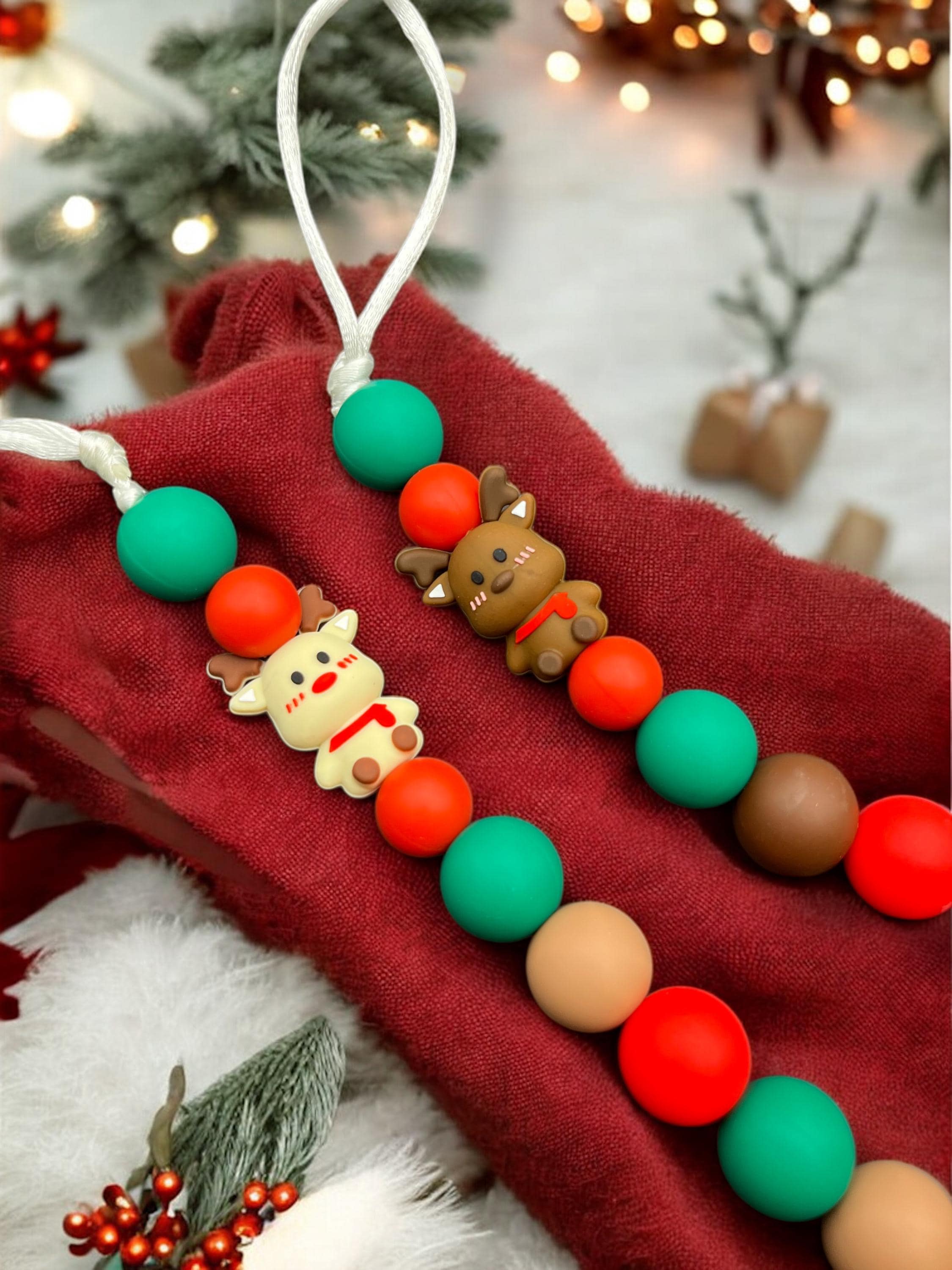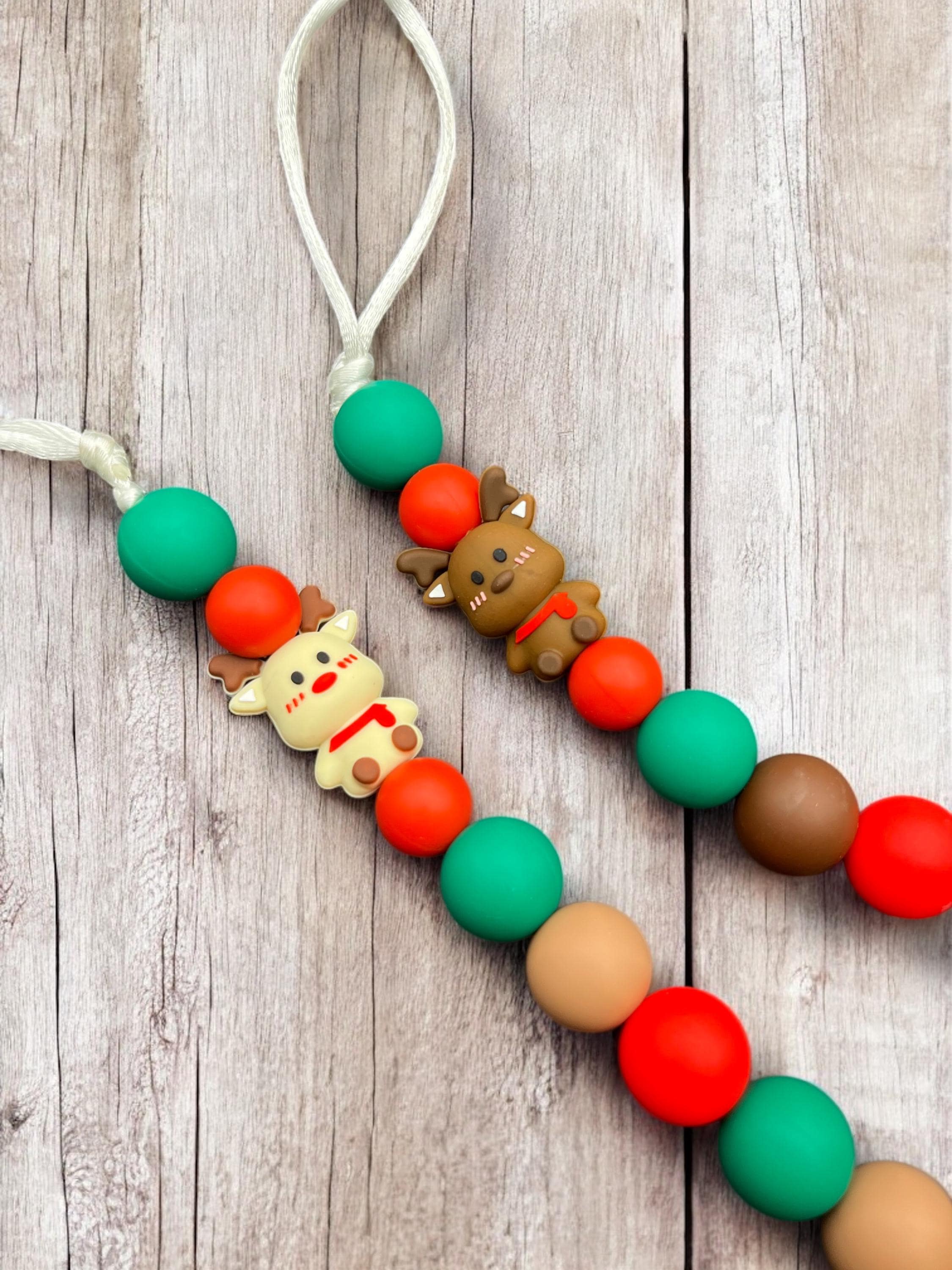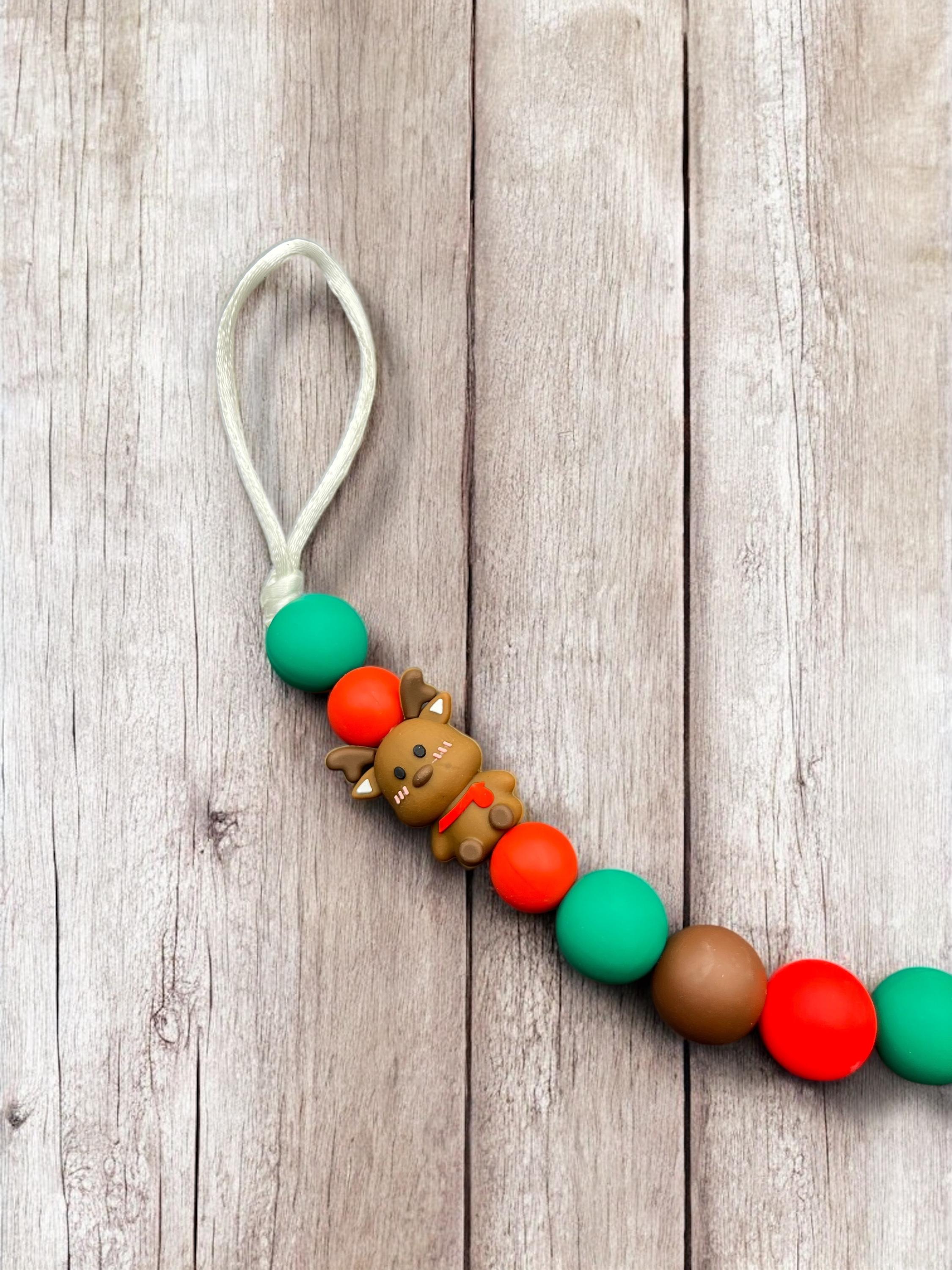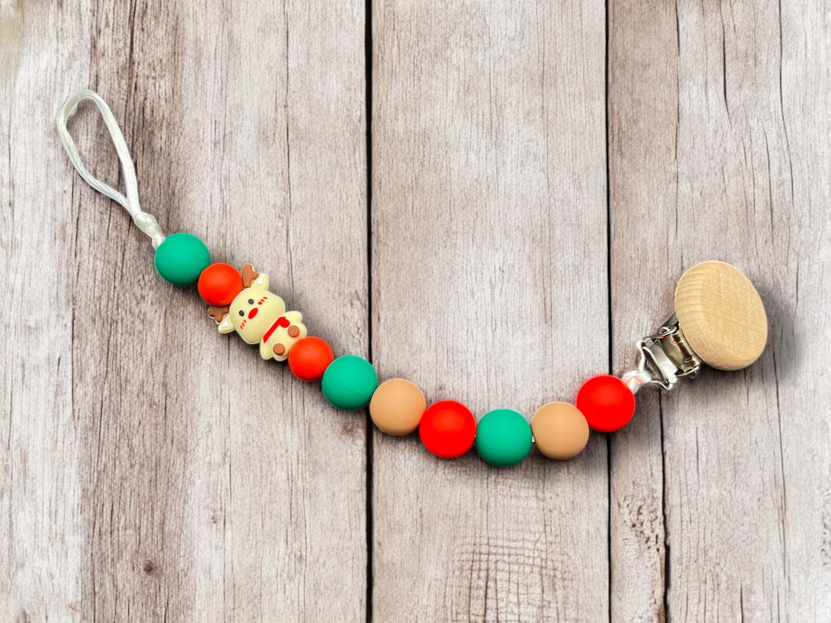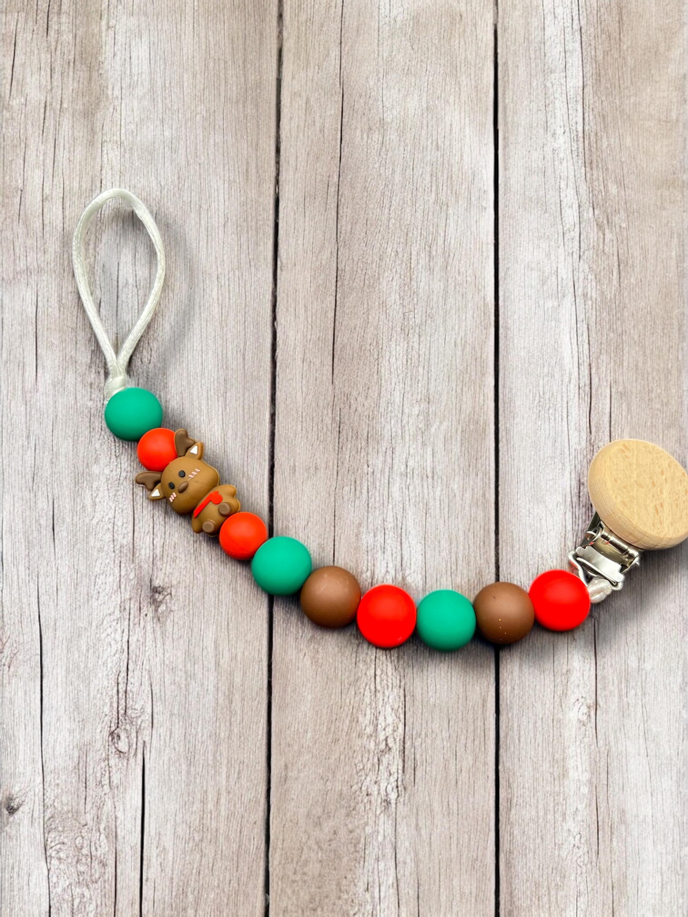 This personalized pacifier clip and rattle comes in our cute Christmas reindeer design. Tell us in the customization what you would like. We can either engrave a reindeer on the clip or baby’s name. We offer different colors.