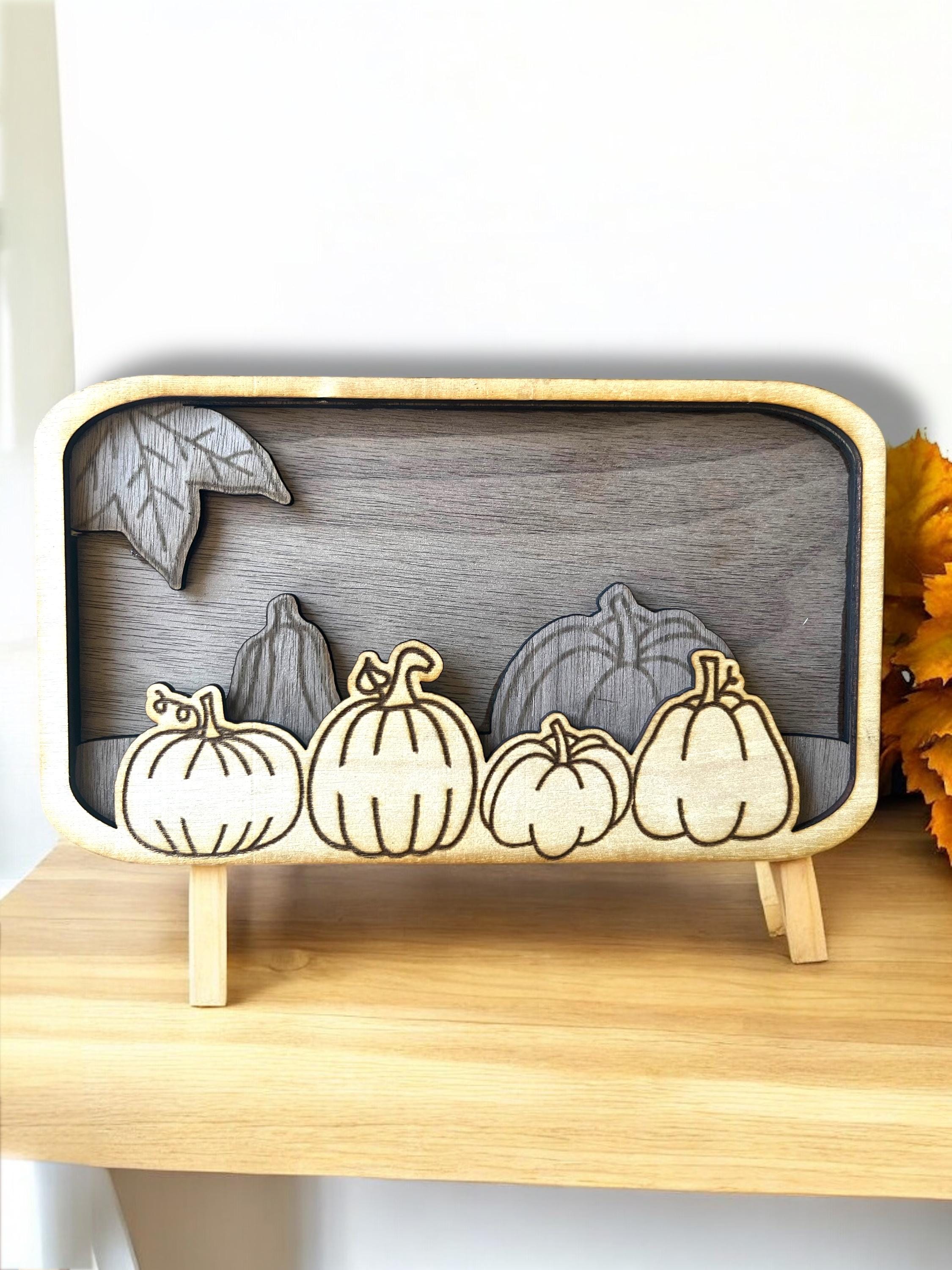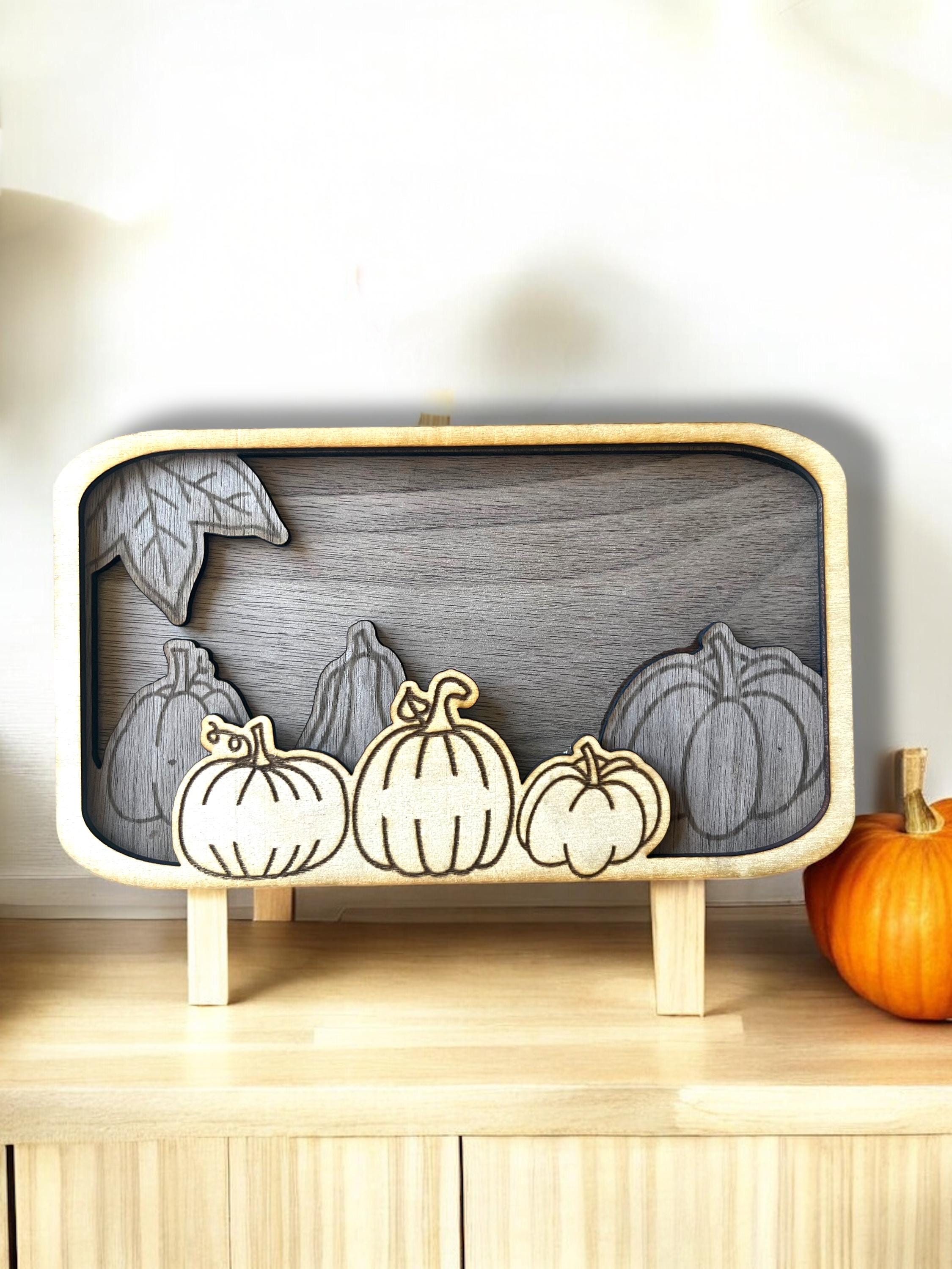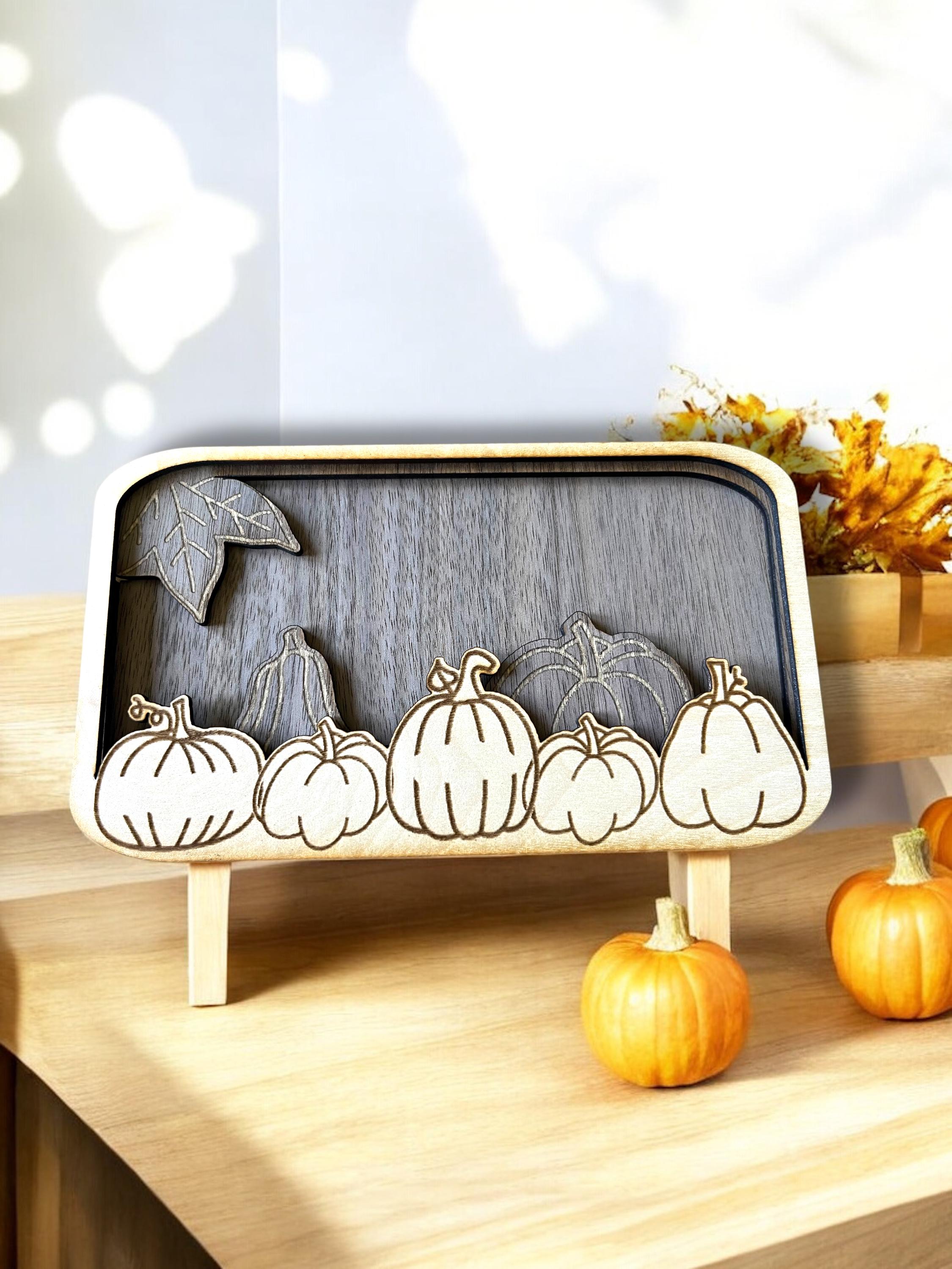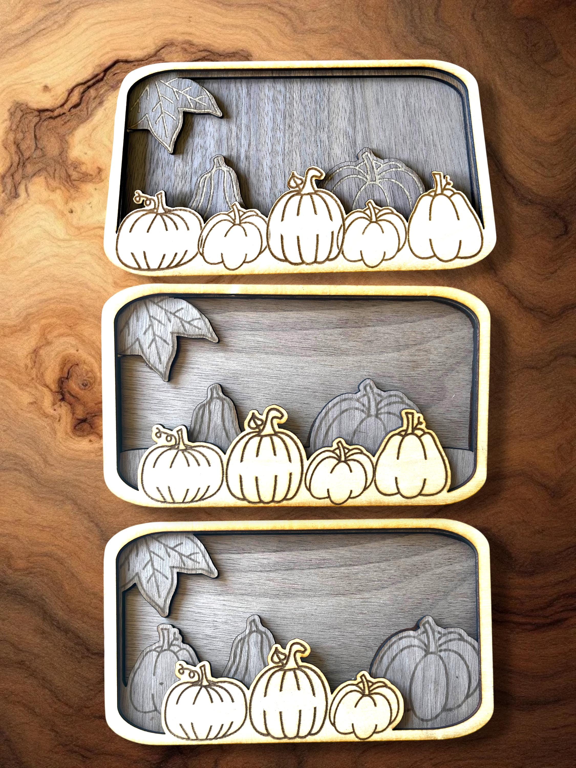 The back and middle layer is made out of Walnut Plywood and the front Layer is Birch Plywood. The middle layer with pumpkins and a leaf is on request.