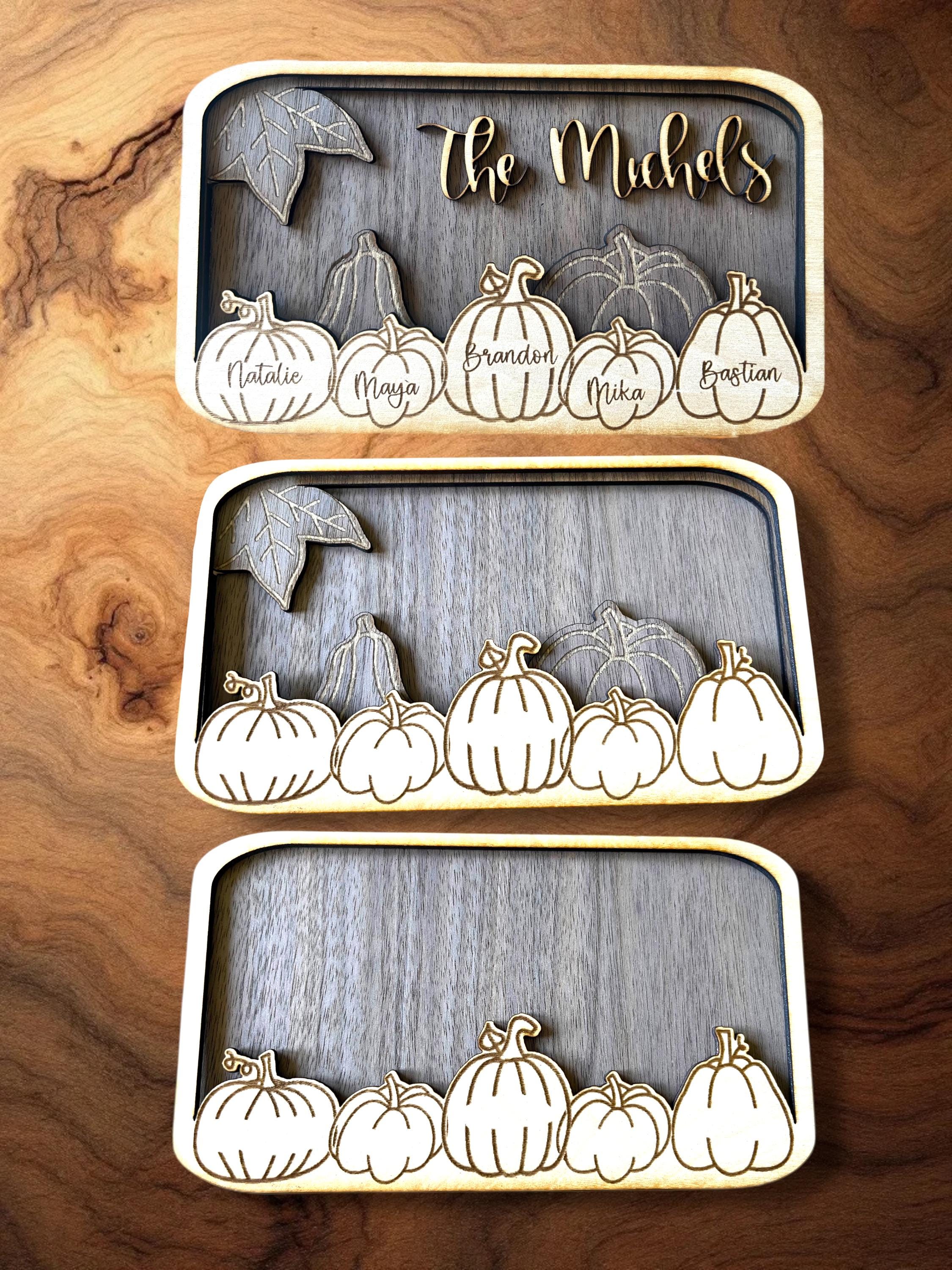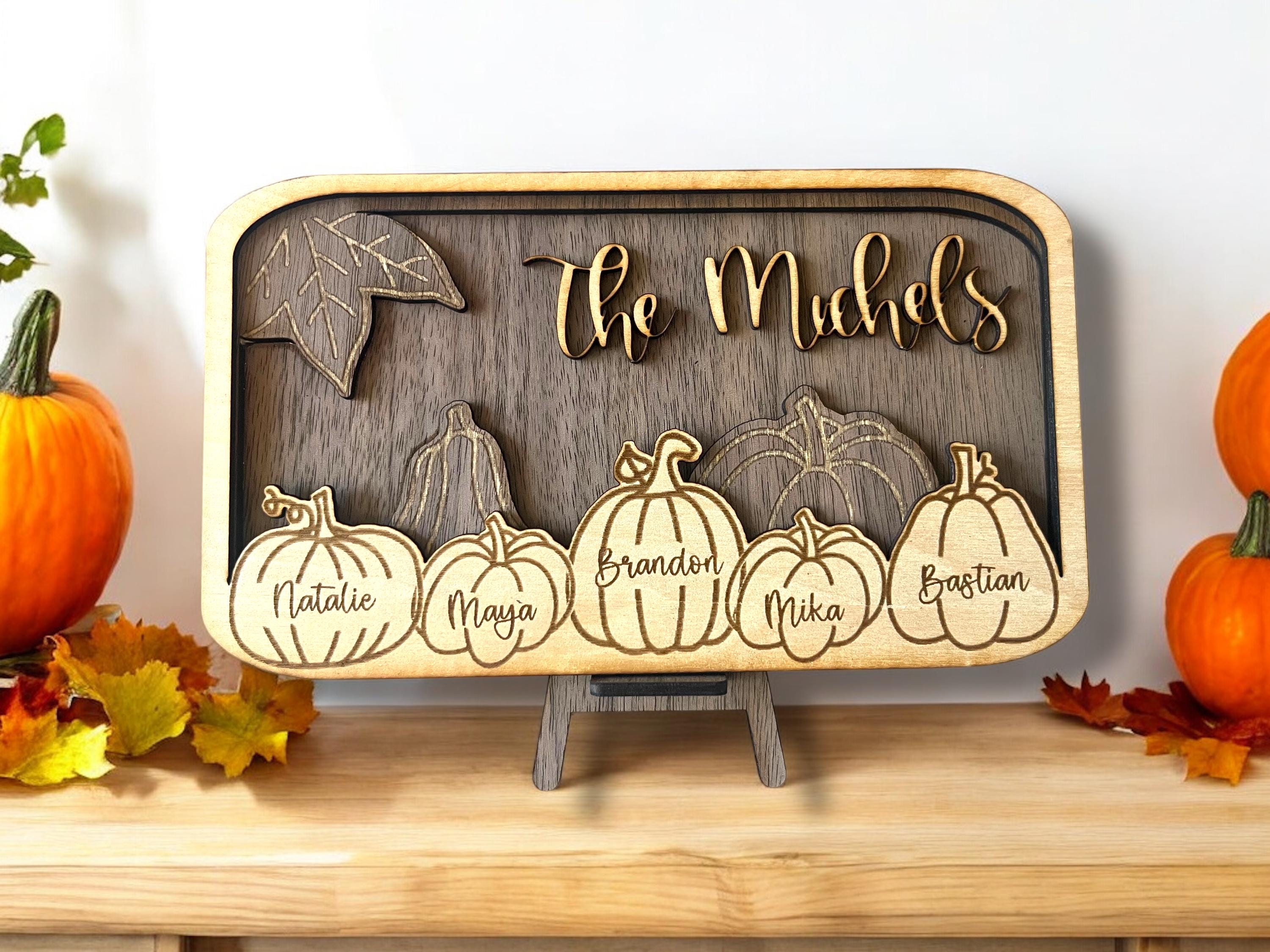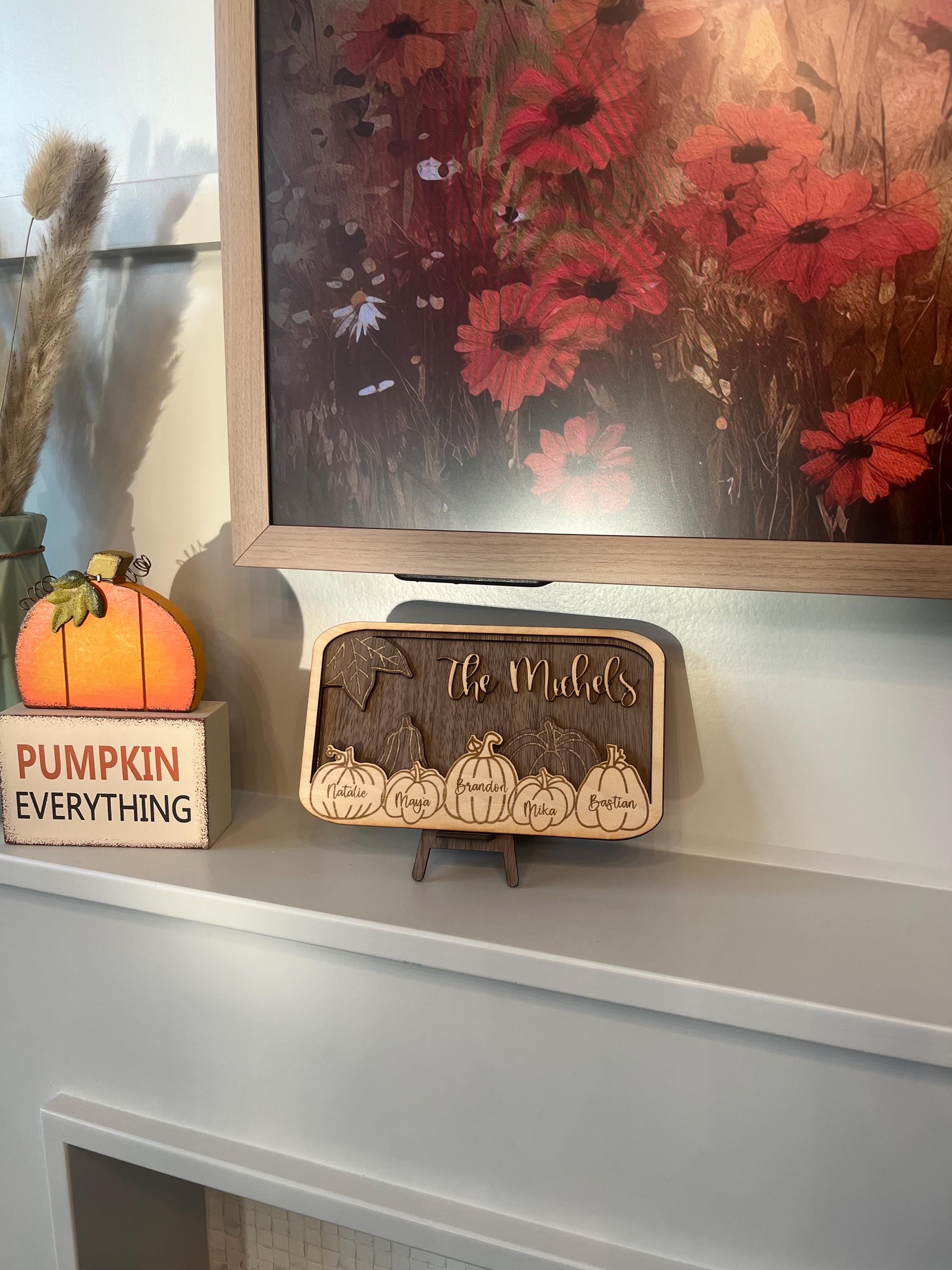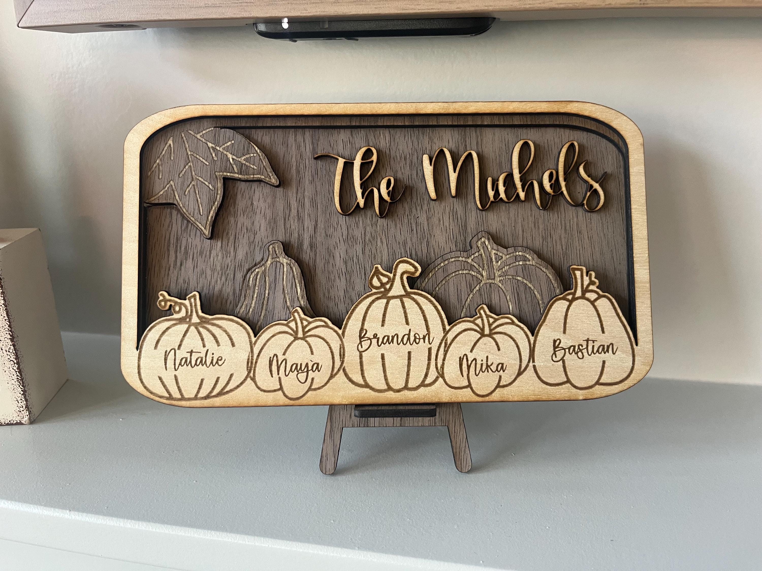 Looking for some uniquely and personal fall decoration or a Thanksgiving host gift? Don’t look any further. Every fireplace and cabinet will shine with this hand crafted family tree frame in pumpkin design. Each pumpkin will be engraved with your family names. Add your dog and cats to have a unique memory of your loved one’s. On request we can add a family name as well.