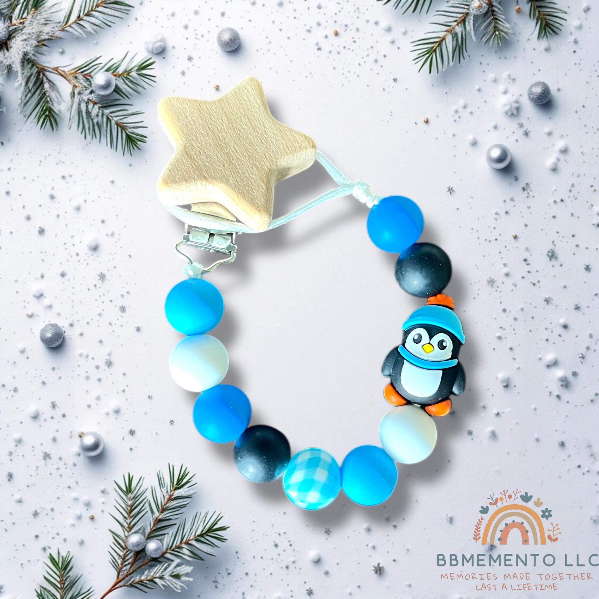 You will find here our winter Holiday themed personalized rattle and pacifier for your little baby girl or boy. Fully made out of Beechwood and colored silicone beads. we can have a round or star shaped clip. the color