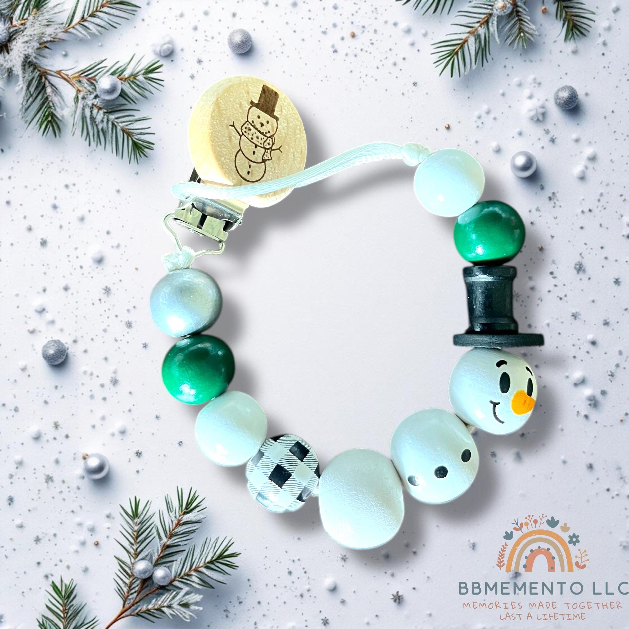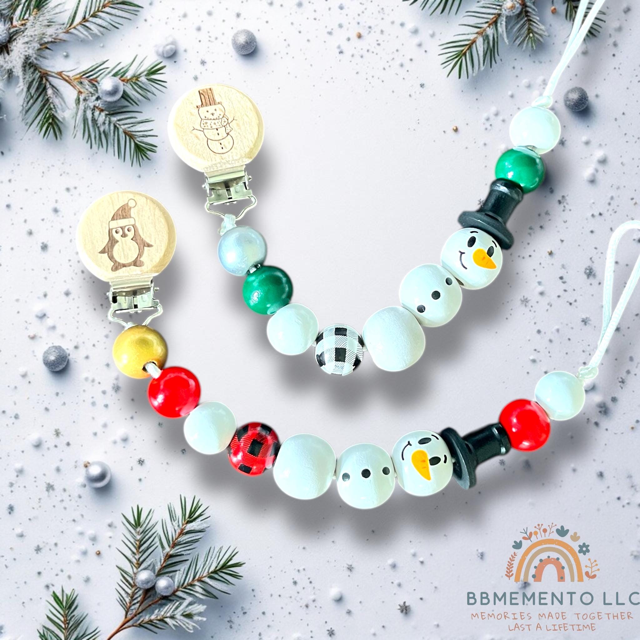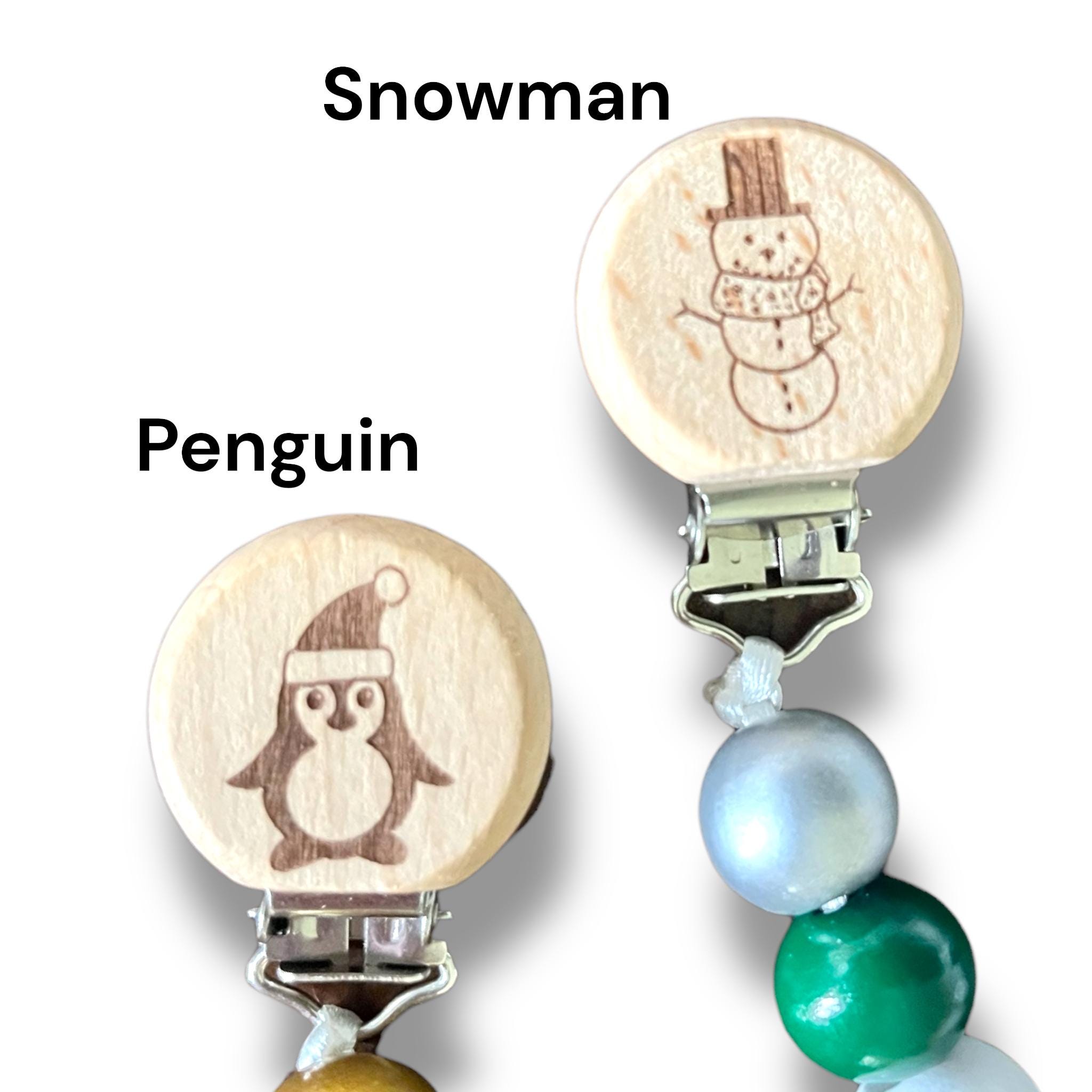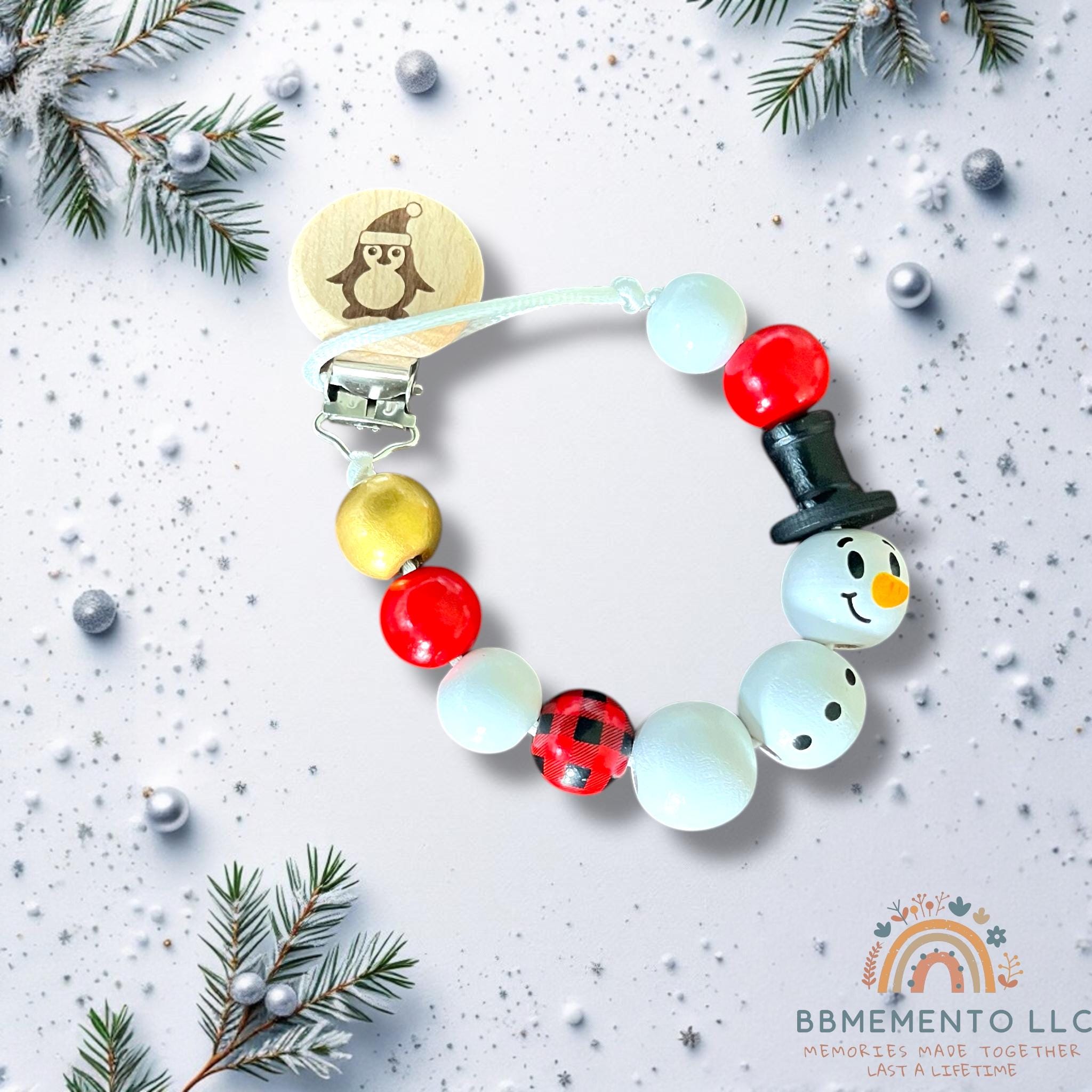 You will find here our Christmas Holiday themed personalized rattle and pacifier for your little baby girl or boy. Fully made out of Beechwood and colored wood beads. We also offer different versions. Ask us for more options! The beads come in different variations so it can change on each item.