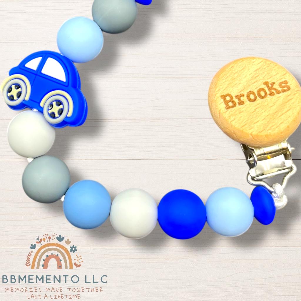 The pacifier clip itself will be laser engraved on request. Please note, that we only offer the English alphabet and are not able to provide special character at this time.
