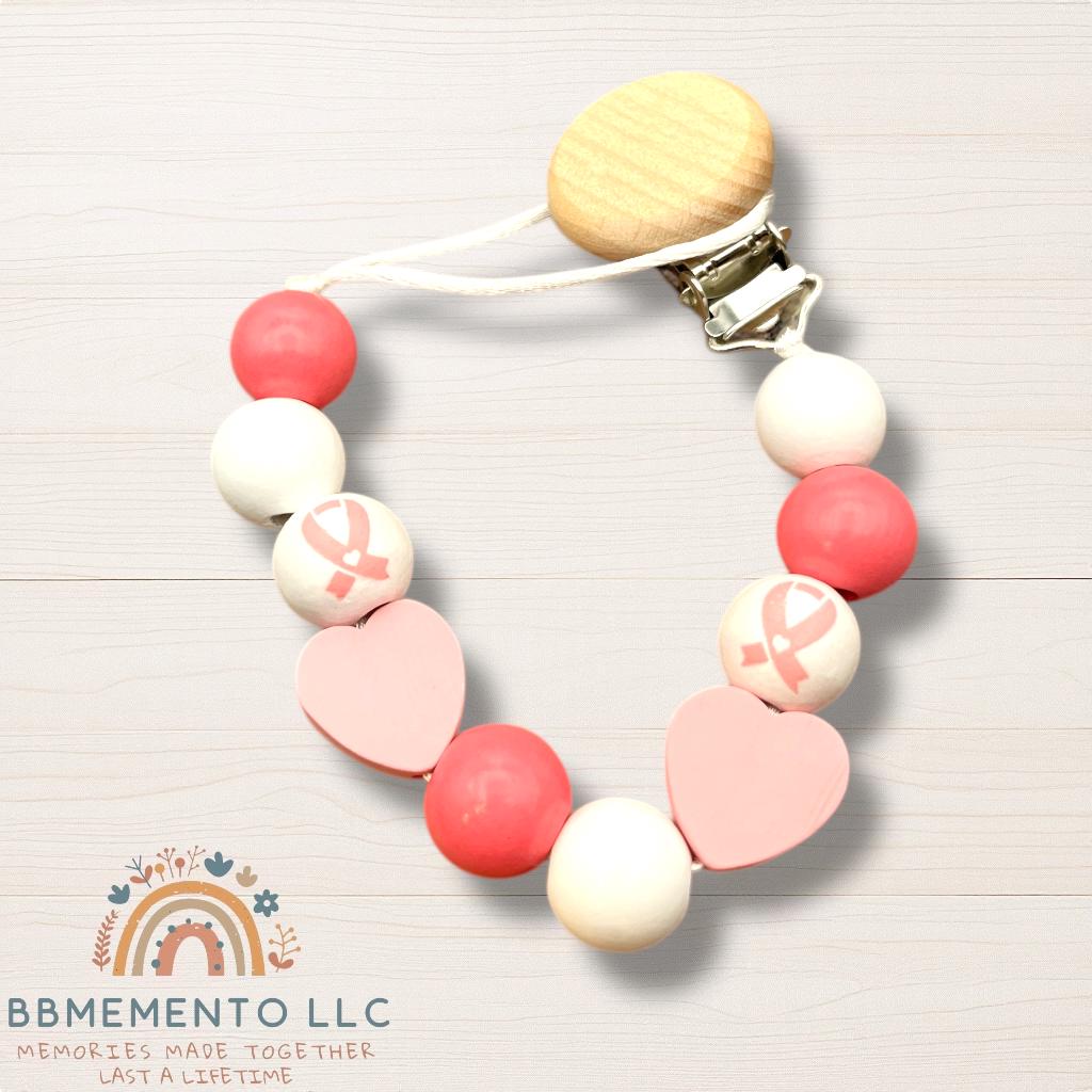 Support Breast Cancer survivor with the little pink bow pacifier clips and rattles. We also offer different versions. Ask us for more options!